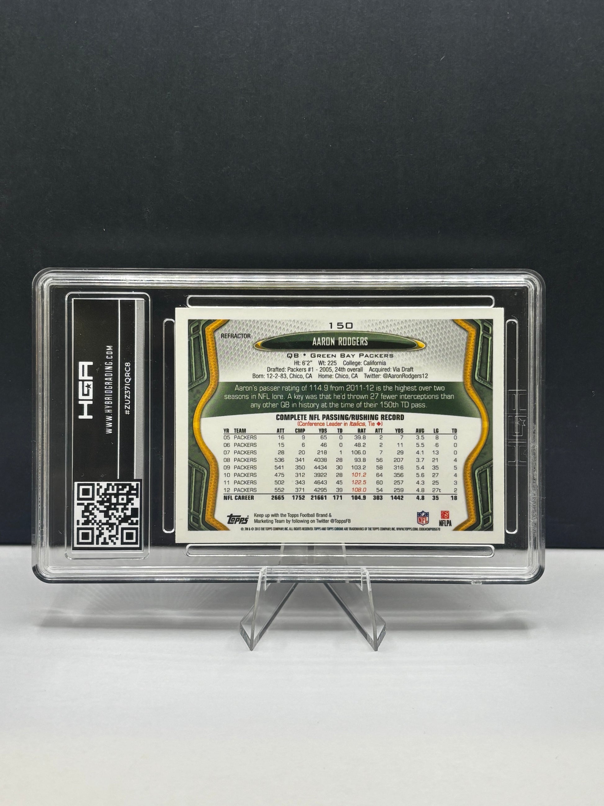 Graded HGA 9.5 Gem Mint, this card boasts excellent centering, sharp corners, clean edges, and strong surface quality. The combination of a bold refractor parallel and near-pristine grade makes it a premium collectible for both Packers fans and Rodgers investors.