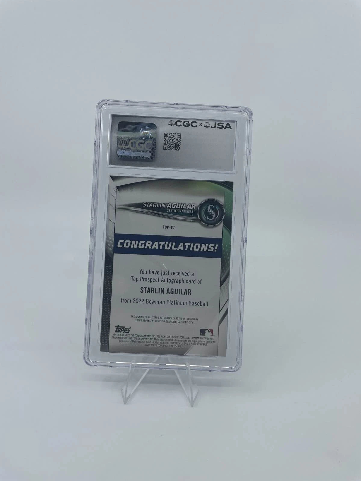 Elevate your collection with this exceptional Starlin Aguilar 2022 Bowman Platinum Red Auto. This highly sought-after autographed card features the promising Mariners prospect, Starlin Aguilar, and has been professionally graded 9.5 for the card and a 10 for the autograph, ensuring its premium condition and appeal. This specific Red Auto variant from the 2022 Bowman Platinum series is a standout piece, showcasing Aguilar's signature clearly and boldly. Collectors of Starlin Aguilar's cards will recognize the significance of this graded autograph, especially alongside other notable releases like his 2021 Bowman Chrome 1st Bowman Auto Speckle Refractor /299, 2022 Bowman Sterling Refractor Auto /150, and his 2022 Bowman Platinum Prospects Auto cards. Starlin Aguilar continues to be a player of interest for the Seattle Mariners, and this graded auto represents a significant addition for any serious baseball card enthusiast. With a grade of 9.5 for the card and 10 for the autograph, this item is a prime example of a premium collectible.