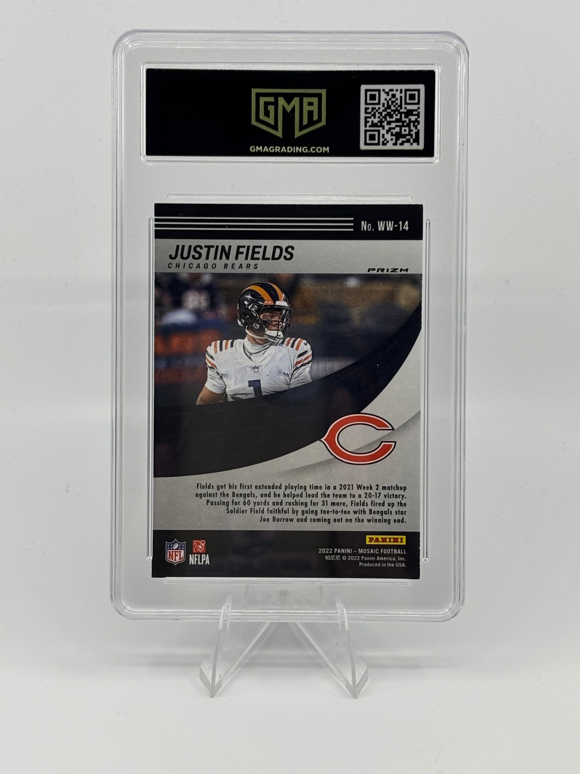 Graded GMA 10 Gem Mint, this card is in flawless condition with strong centering, sharp corners, and clean surfaces. With Fields continuing to develop as one of the league’s most exciting young QBs, Mosaic parallels like this are especially popular among collectors.