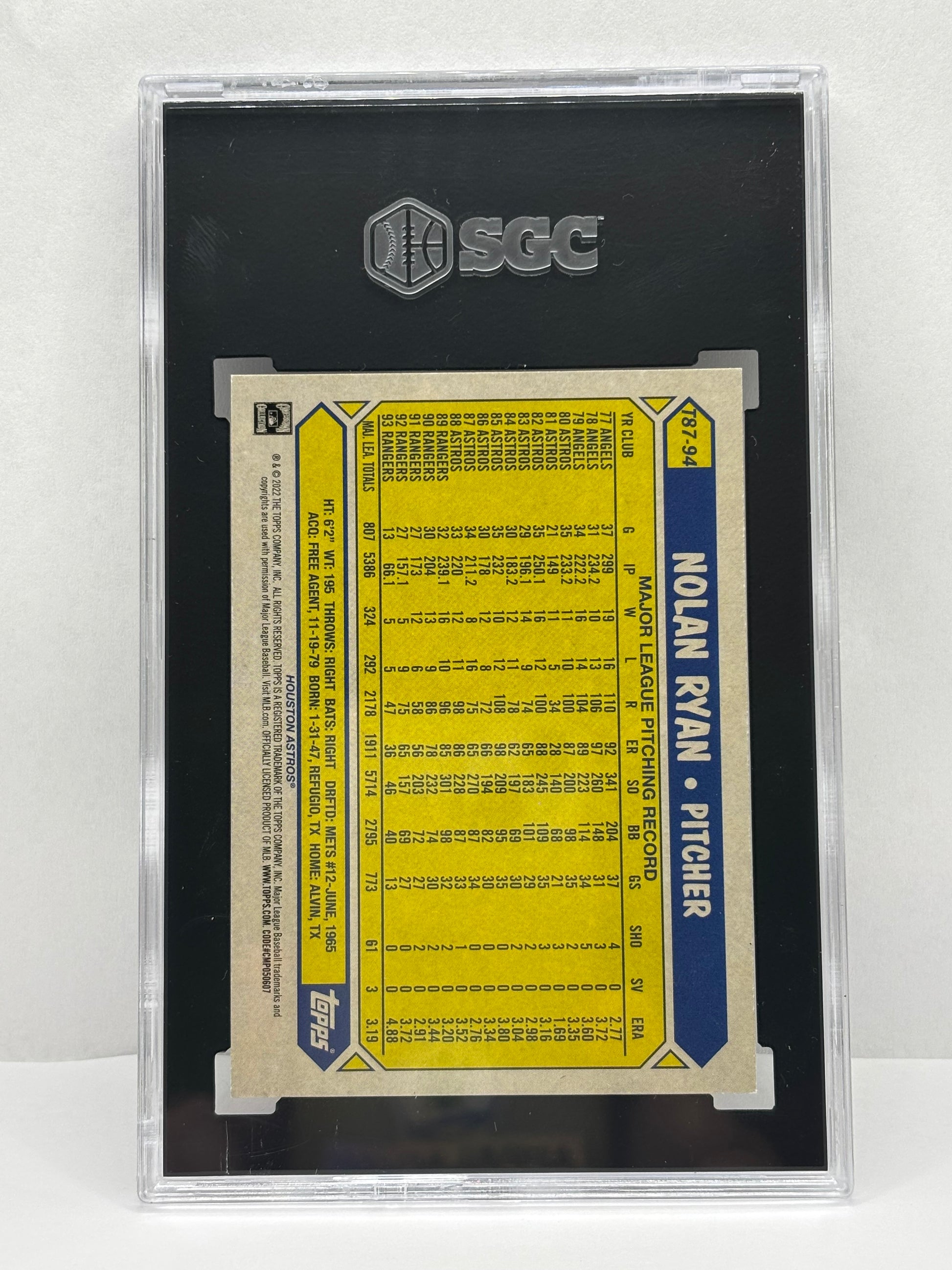 Graded SGC 10 (Gem Mint), this card is in pristine condition, featuring sharp corners, vibrant color, and clean centering. Nolan Ryan’s legendary career—defined by seven no-hitters and over 5,700 strikeouts—makes this tribute card a standout collectible for fans of baseball history and Topps heritage designs.