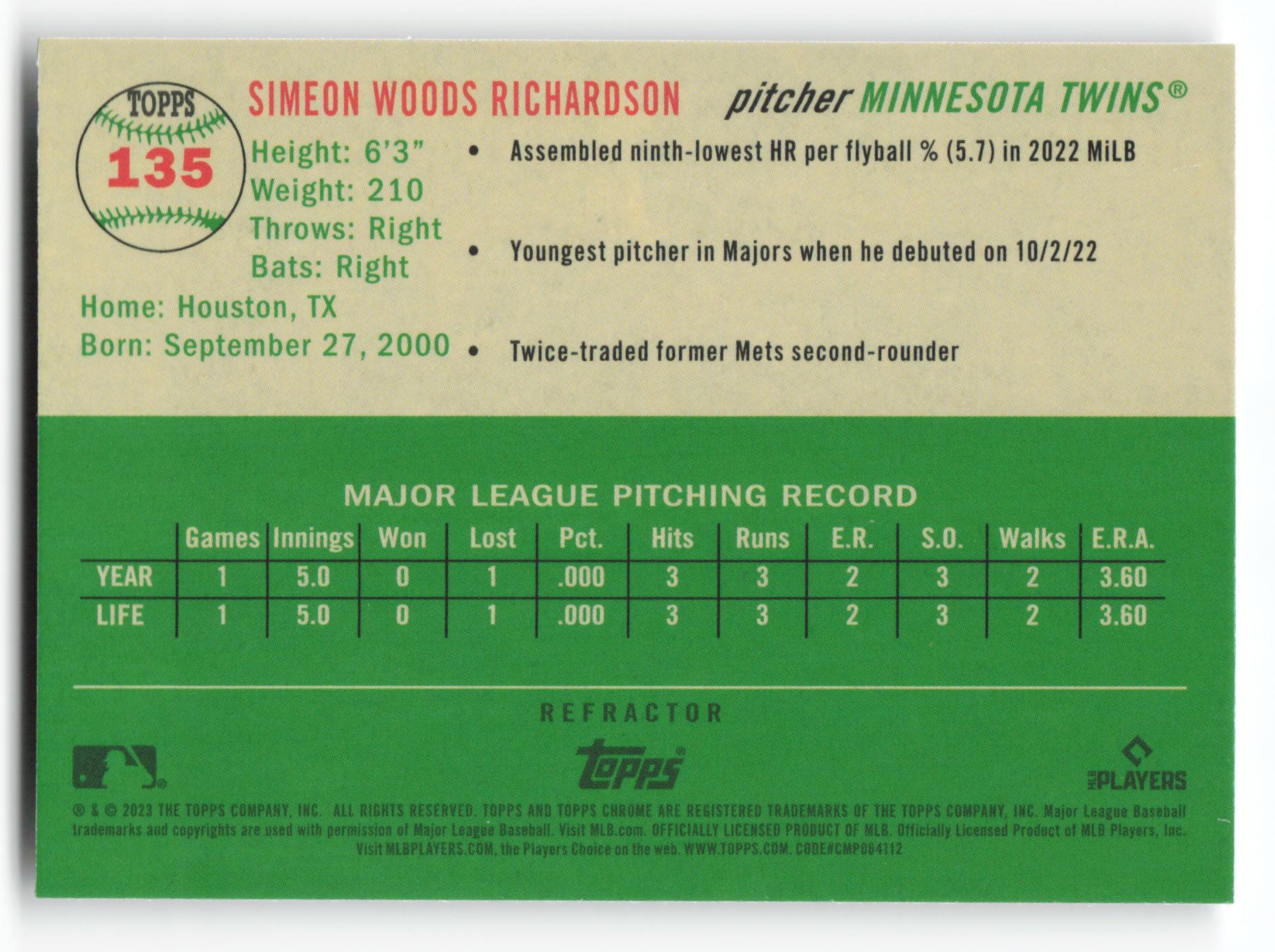 Card: Simeon Woods Richardson Team: Minnesota Twins Card No: #135 Set: 2023 Topps Chrome Platinum Anniversary Year: 2023 Brand: Topps Location: Baseball 001 B 5 Z