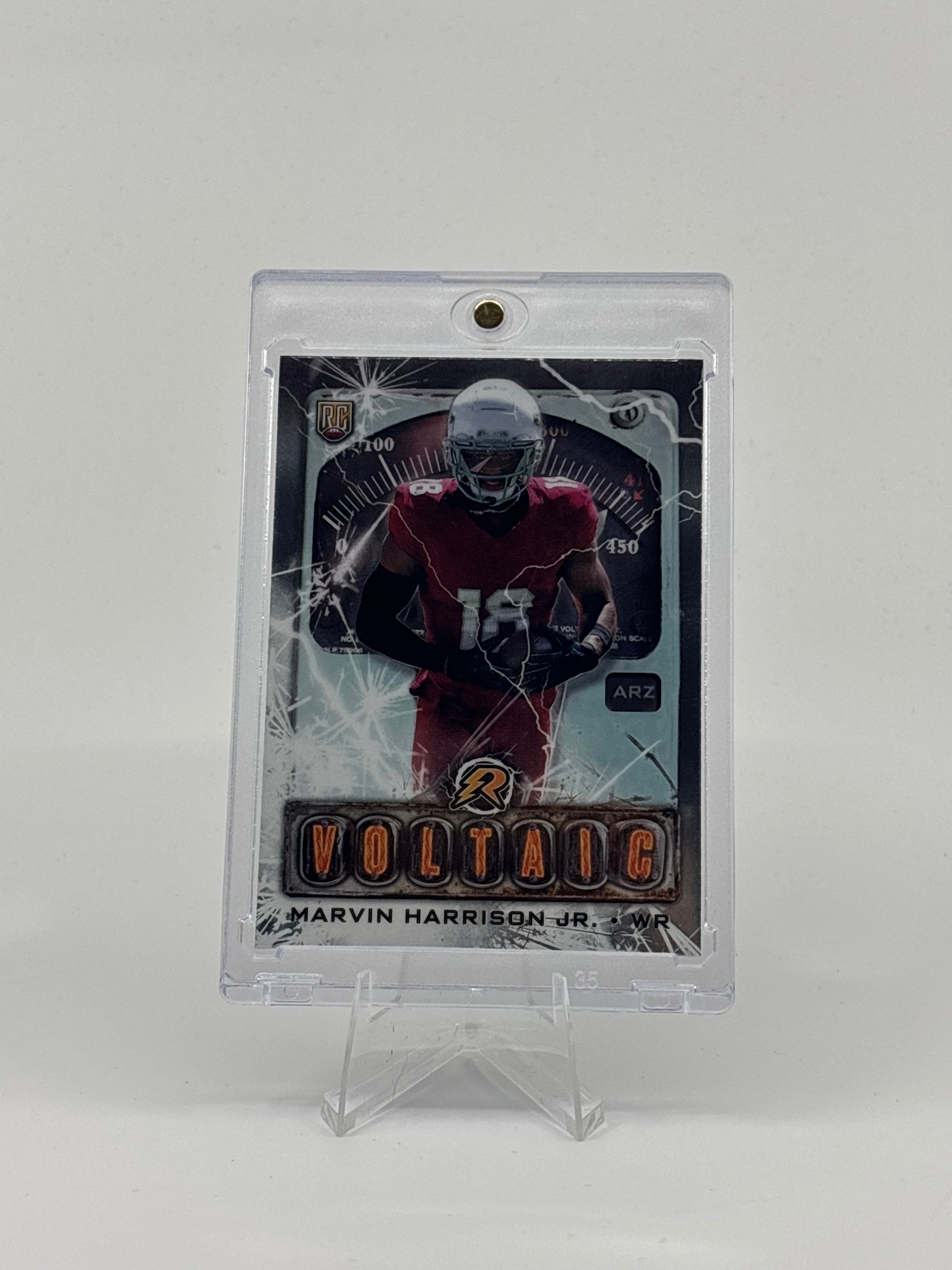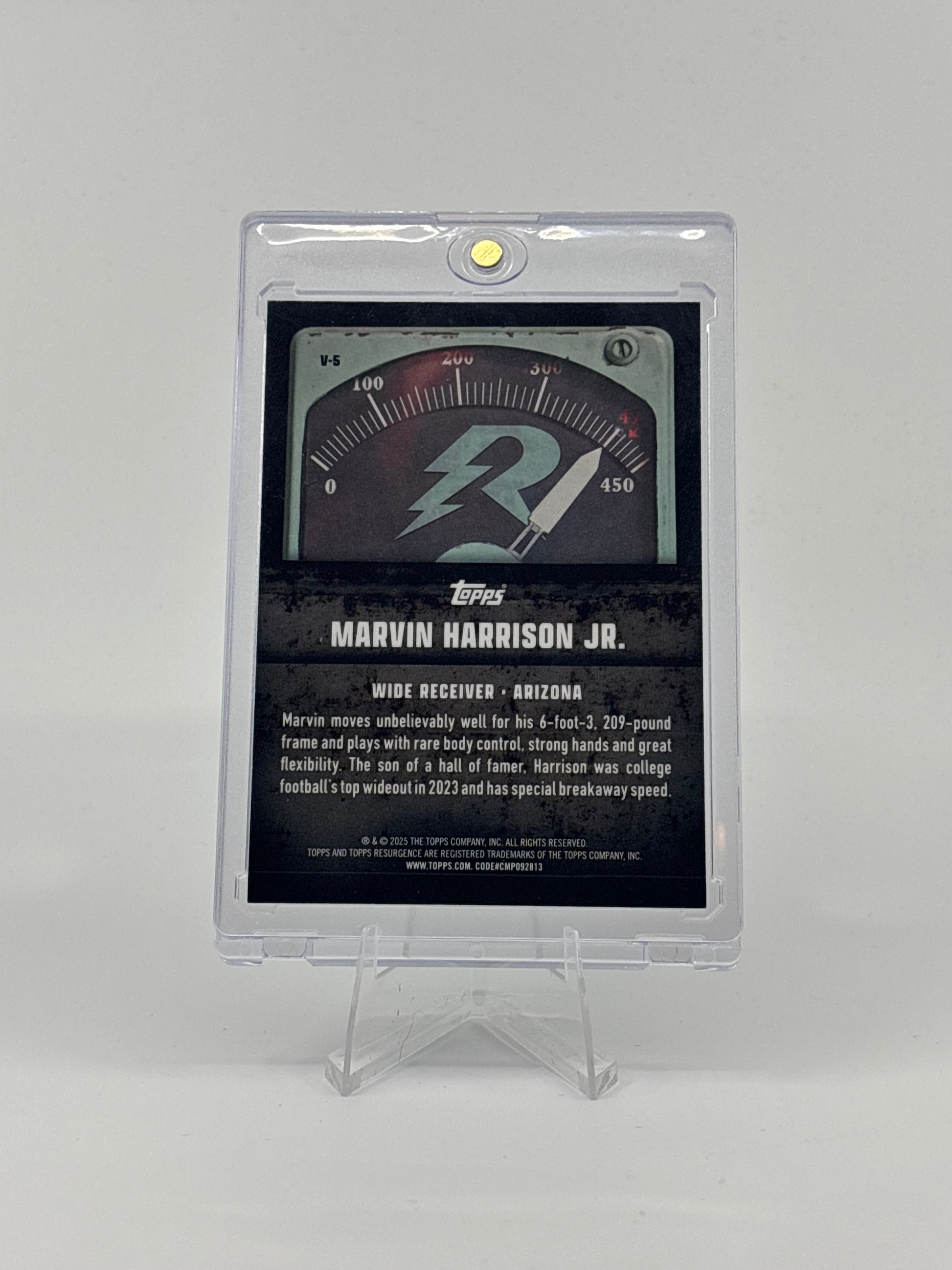 2024 Topps Resurgence – Marvin Harrison Jr. Voltaic Refractor RC #V-5 captures the dynamic wide receiver in one of Resurgence’s most electrifying insert parallels. The Voltaic design features bold foil textures and vivid refractor shine, emphasizing Harrison Jr.’s explosive playmaking skills.