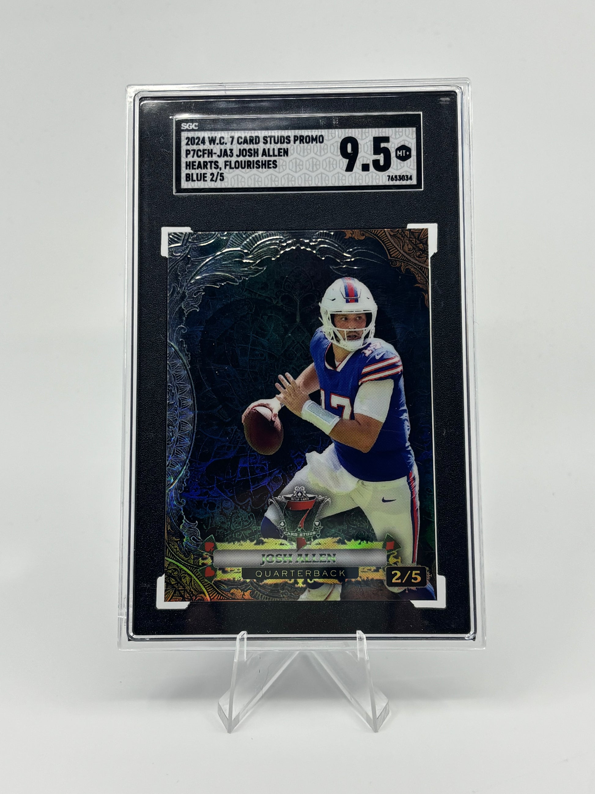 2024 Wild Card – 7 Card Stud Josh Allen Blue /5 #P7CFH-JA3 SGC 9.5 is an exceptionally scarce card of Buffalo’s superstar quarterback. With only five copies produced, this low-numbered Blue parallel captures the energy of Wild Card’s bold design while highlighting one of the NFL’s most dynamic playmakers.