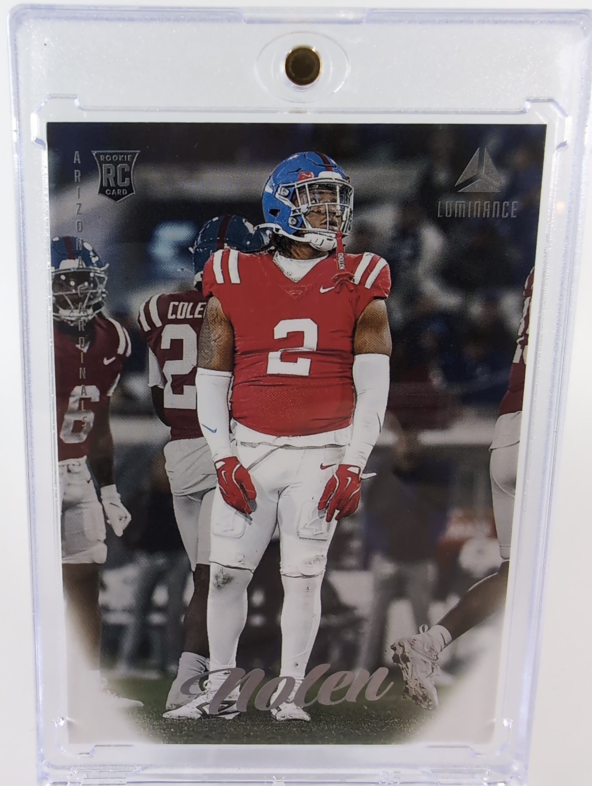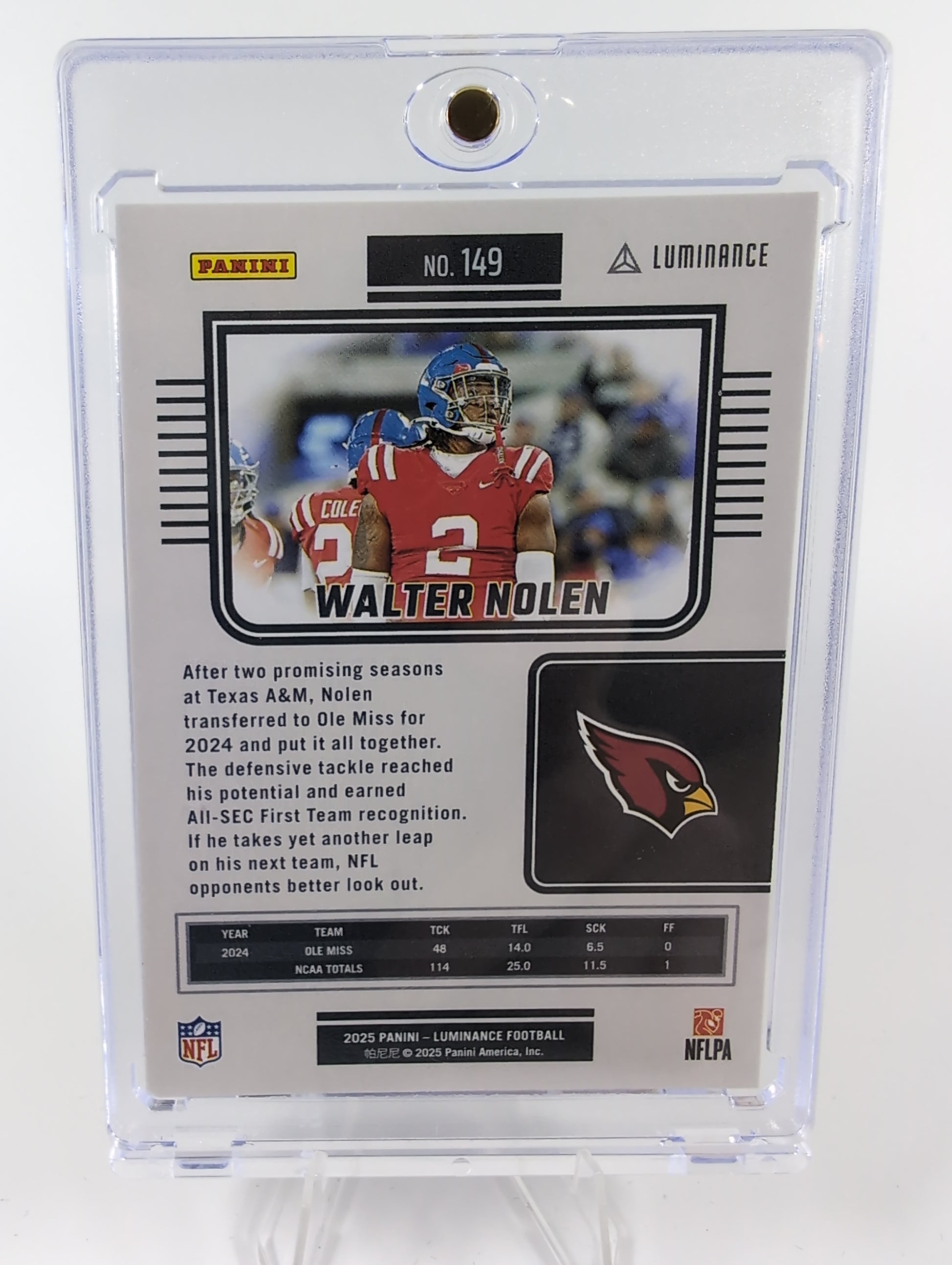 2025 Panini Luminance – Walter Nolen Rookie #149 showcases the Texans’ rookie defensive lineman in Luminance’s bold, full-bleed vertical design. The sharp photography and modern layout highlight Nolen’s power and presence in the trenches, making this an impactful first-year card for the standout prospect.
