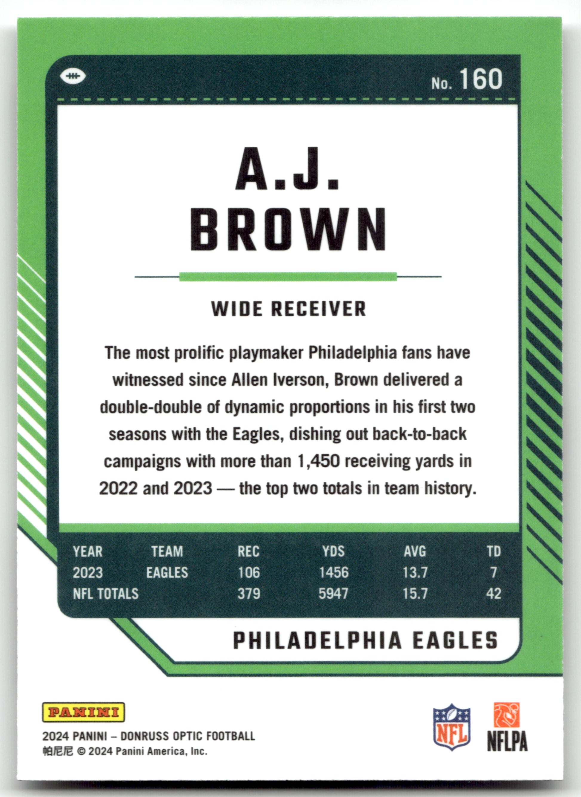 Card: A.J. Brown Team: Philadelphia Eagles Card No: #160 Set: 2024 Donruss Optic Year: 2024 Brand: Optic Location: Assorted 001 001 001 F