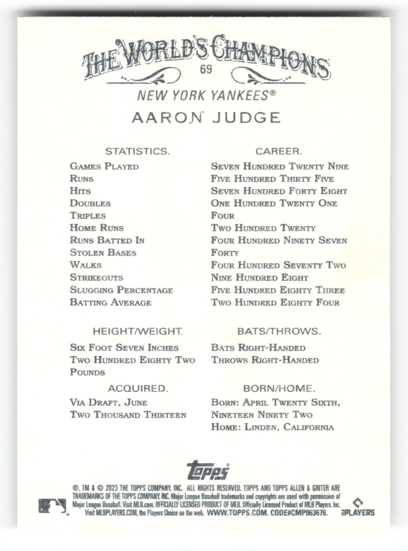Card: Aaron Judge Team: New York Yankees Card No: #69 Set: 2023 Topps Allen & Ginter Year: 2023 Brand: Topps Location: Baseball 001 B 5 Z