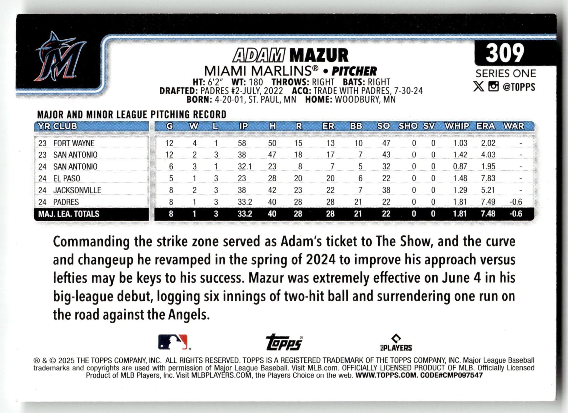 Card: Adam Mazur Team: Miami Marlins Card No: #309 Set: 2025 Topps Year: 2025 Brand: Topps Location: Assorted 001 001 001 G