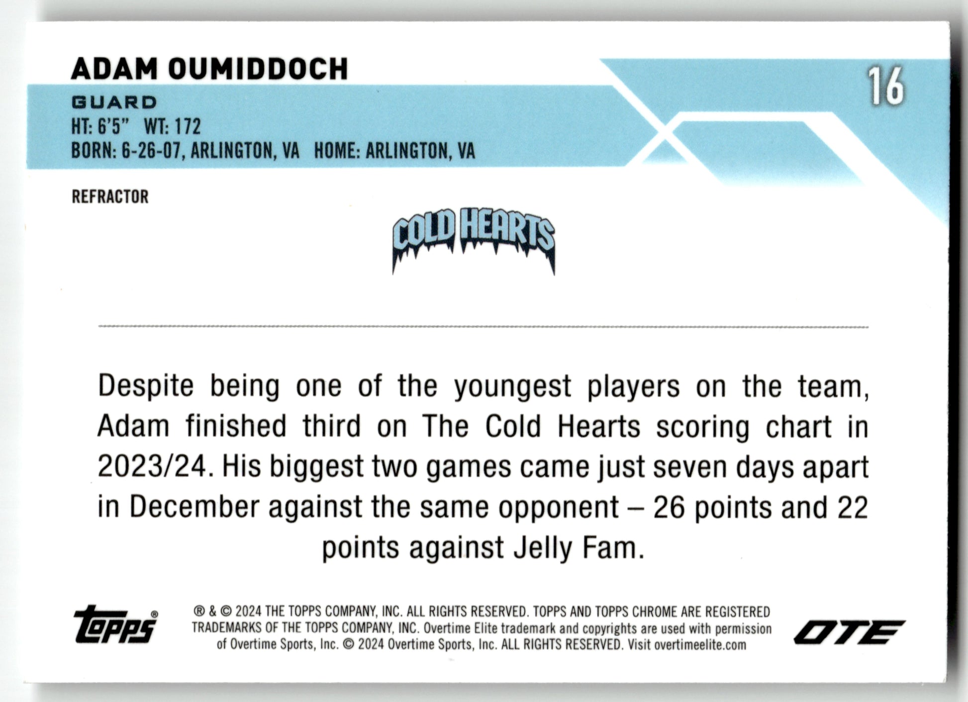 Card: Adam Oumiddoch Team: Cold Hearts Card No: #16 Set: 2023-24 Topps Chrome Overtime Elite Year: 2023 Brand: Topps Location: Assorted 001 001 001 E