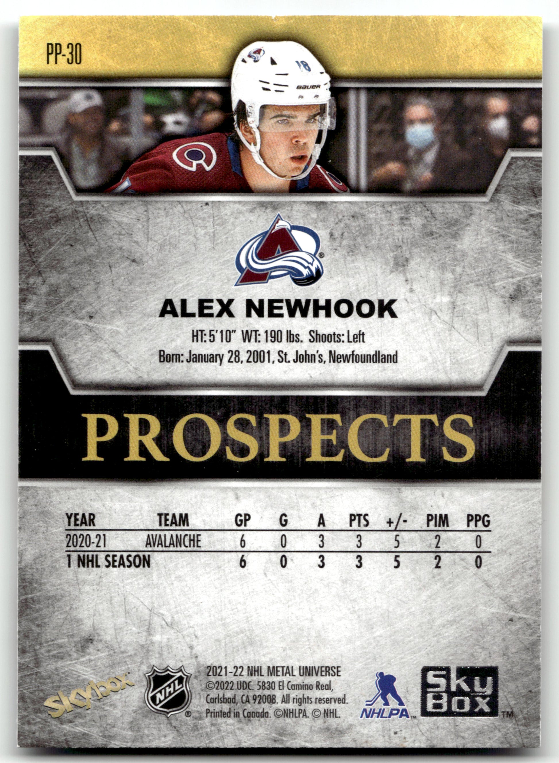 Card: Alex Newhook Team: Colorado Avalanche Card No: #PP-30 Set: 2021-22 SkyBox Metal Universe Year: 2021 Brand: Location: Assorted 001 001 001 F