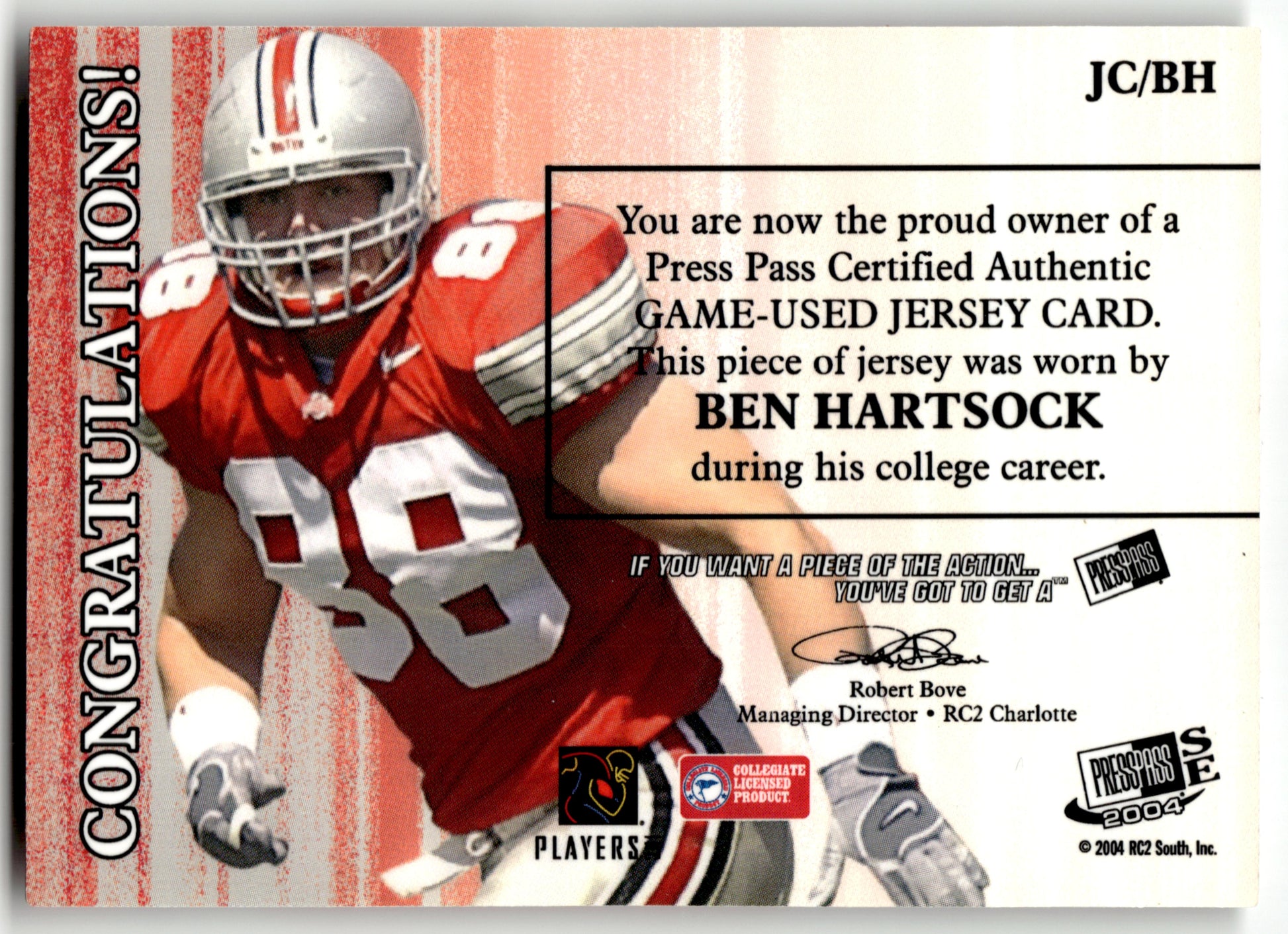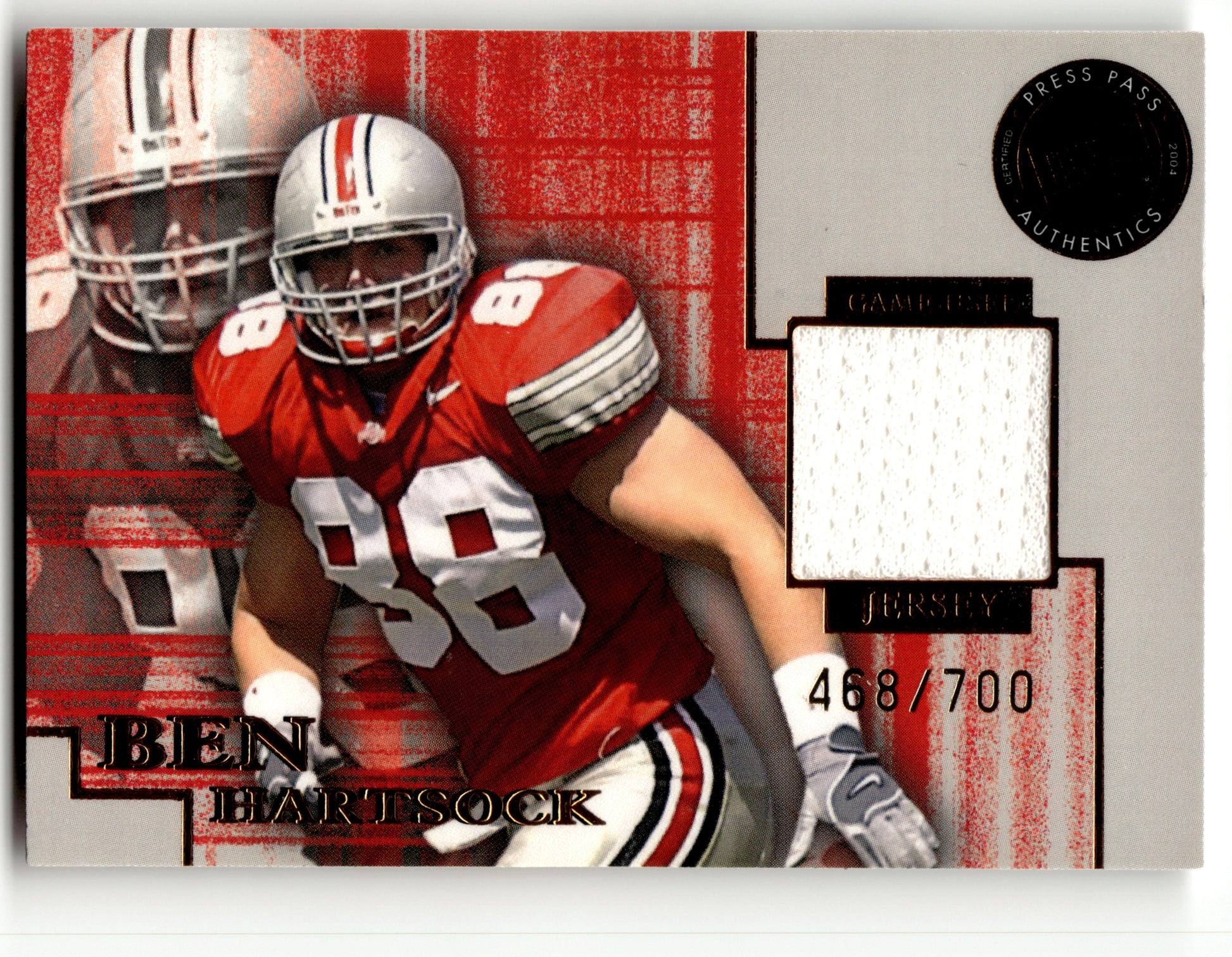 Card: Ben Hartsock Team: Ohio State Buckeyes Card No: #JC/BH Set: 2004 Press Pass SE Year: 2004 Brand: Location: Assoted 001 001 001 B