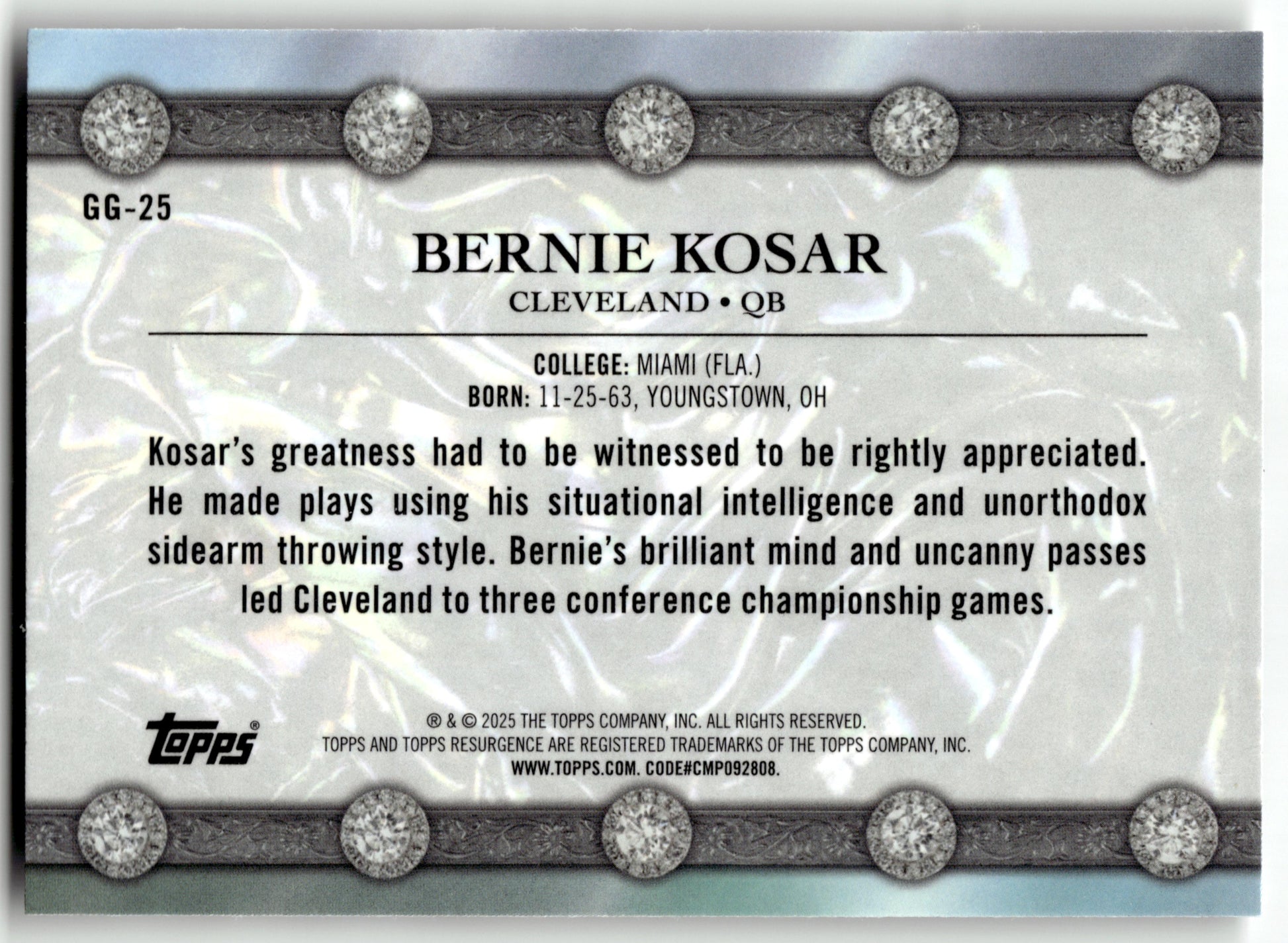 Card: Bernie Kosar Team: Cleveland Browns Card No: #GG-25 Set: 2024 Topps Resurgence Year: 2024 Brand: Topps Location: Assoted 001 001 001 B