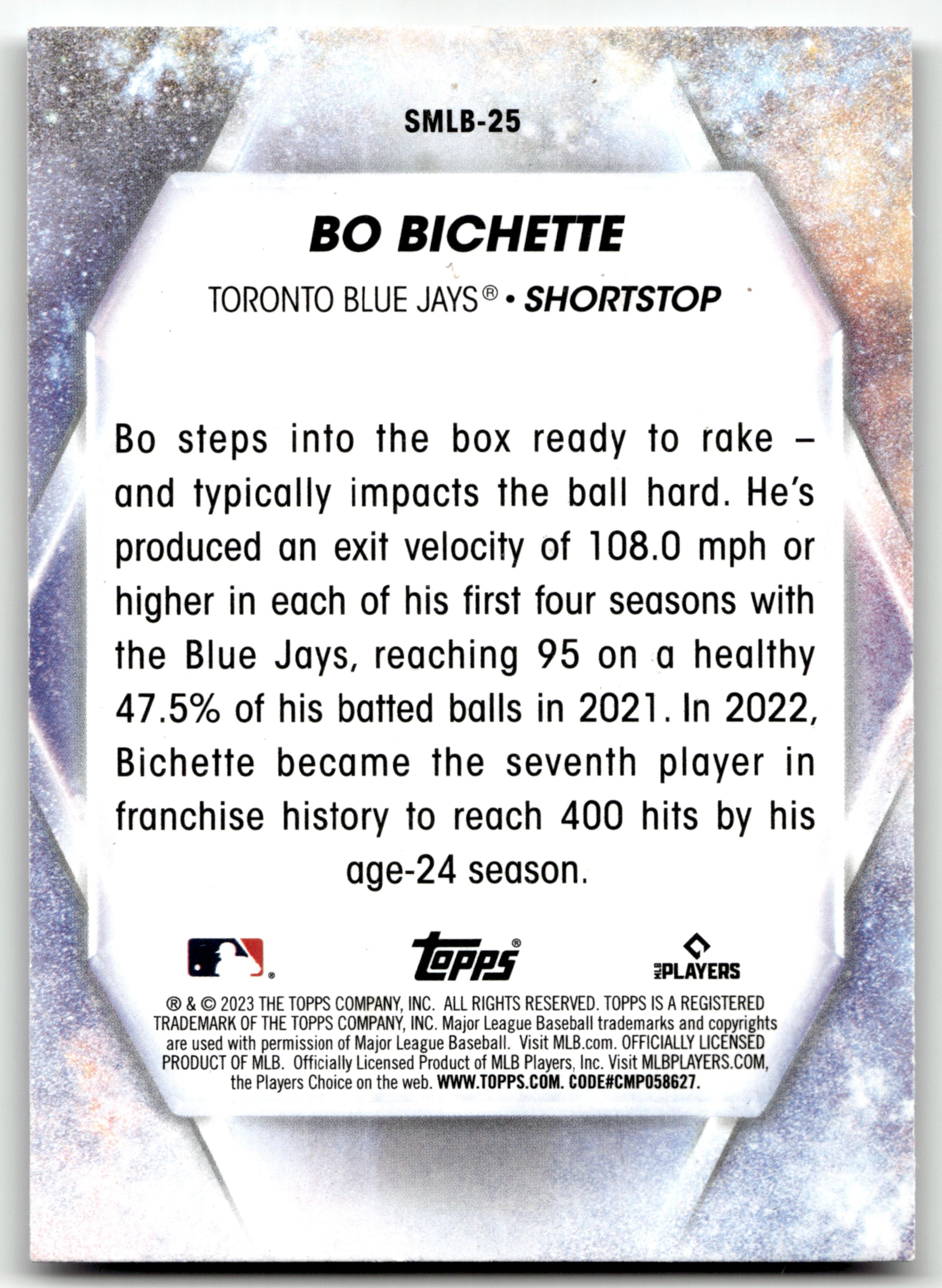 Card: Bo Bichette Team: Toronto Blue Jays Card No: #SMLB-25 Set: 2023 Topps Year: 2023 Brand: Topps Location: Assorted 001 001 001 D