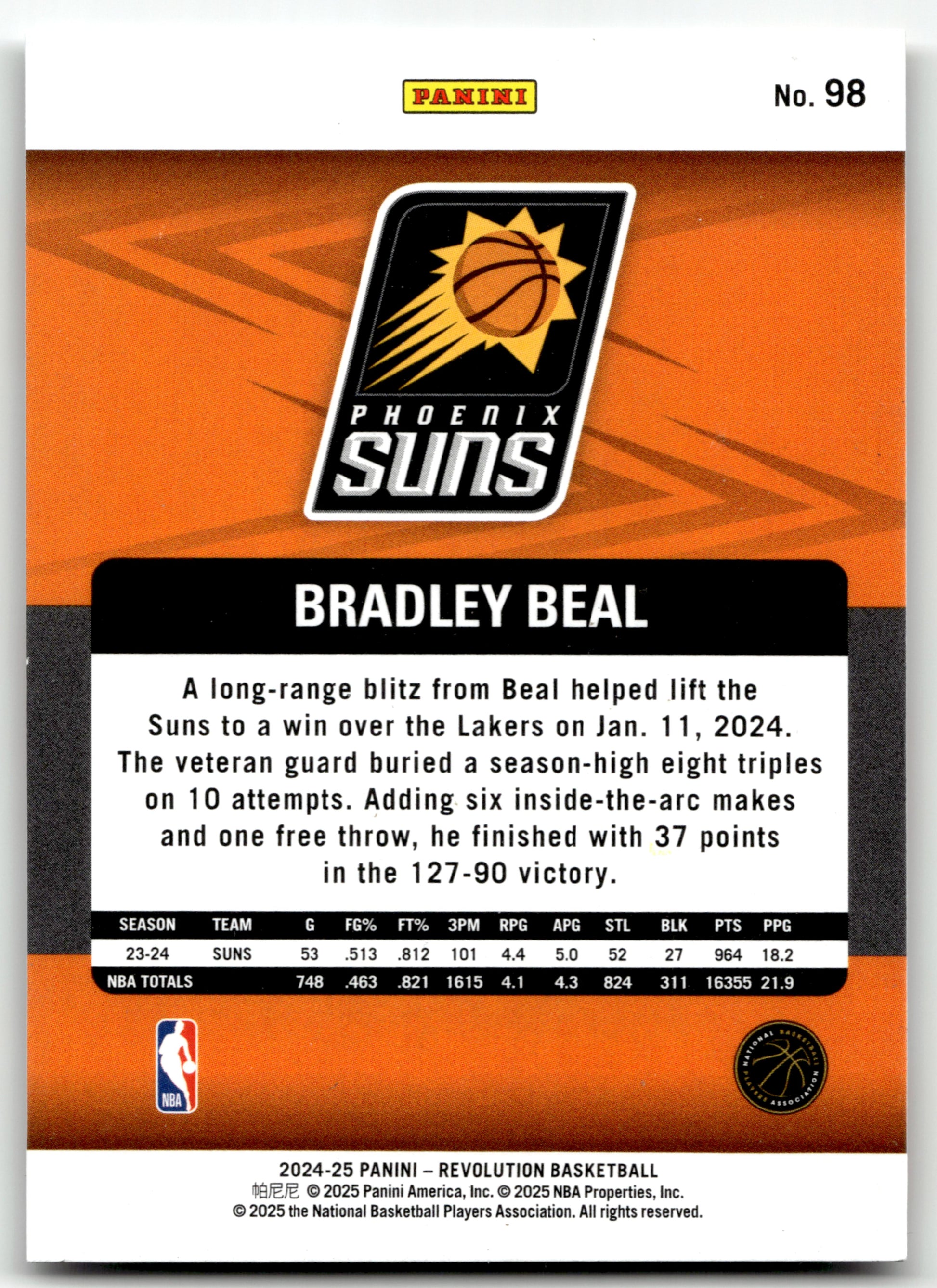 Card: Bradley Beal Team: Phoenix Suns Card No: #98 Set: 2024-25 Panini Revolution Year: 2024 Brand: Panini Location: Assorted 001 001 001 D