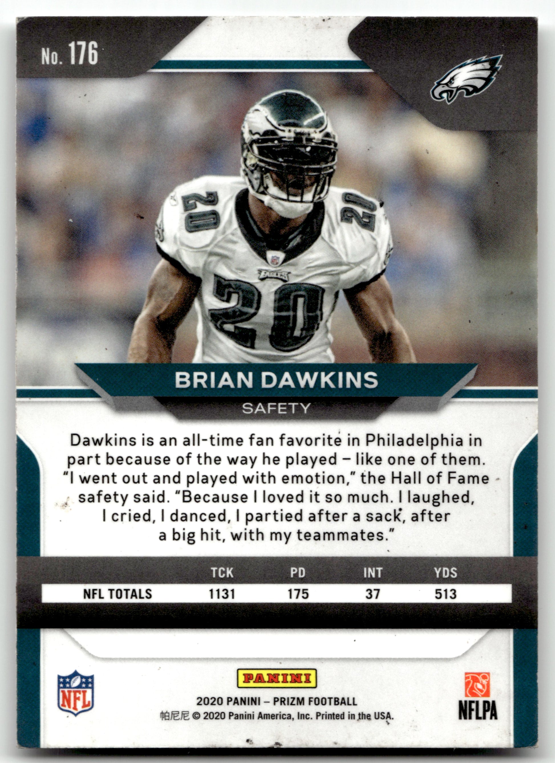 Card: Brian Dawkins Team: Philadelphia Eagles Card No: #176 Set: 2020 Panini Prizm Year: 2020 Brand: Panini Location: Assoted 001 001 001 B
