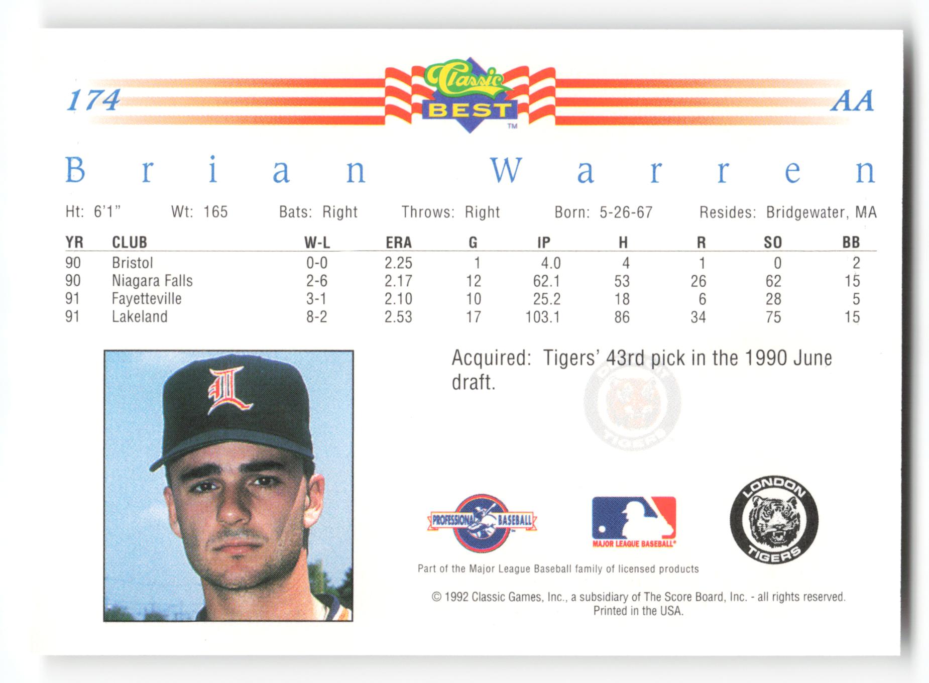 Card: Brian Warren Team: London Tigers Card No: #174 Set: 1992 Classic Best Year: 1992 Brand: MLB Location: Baseball 001 001 5 Sec A
