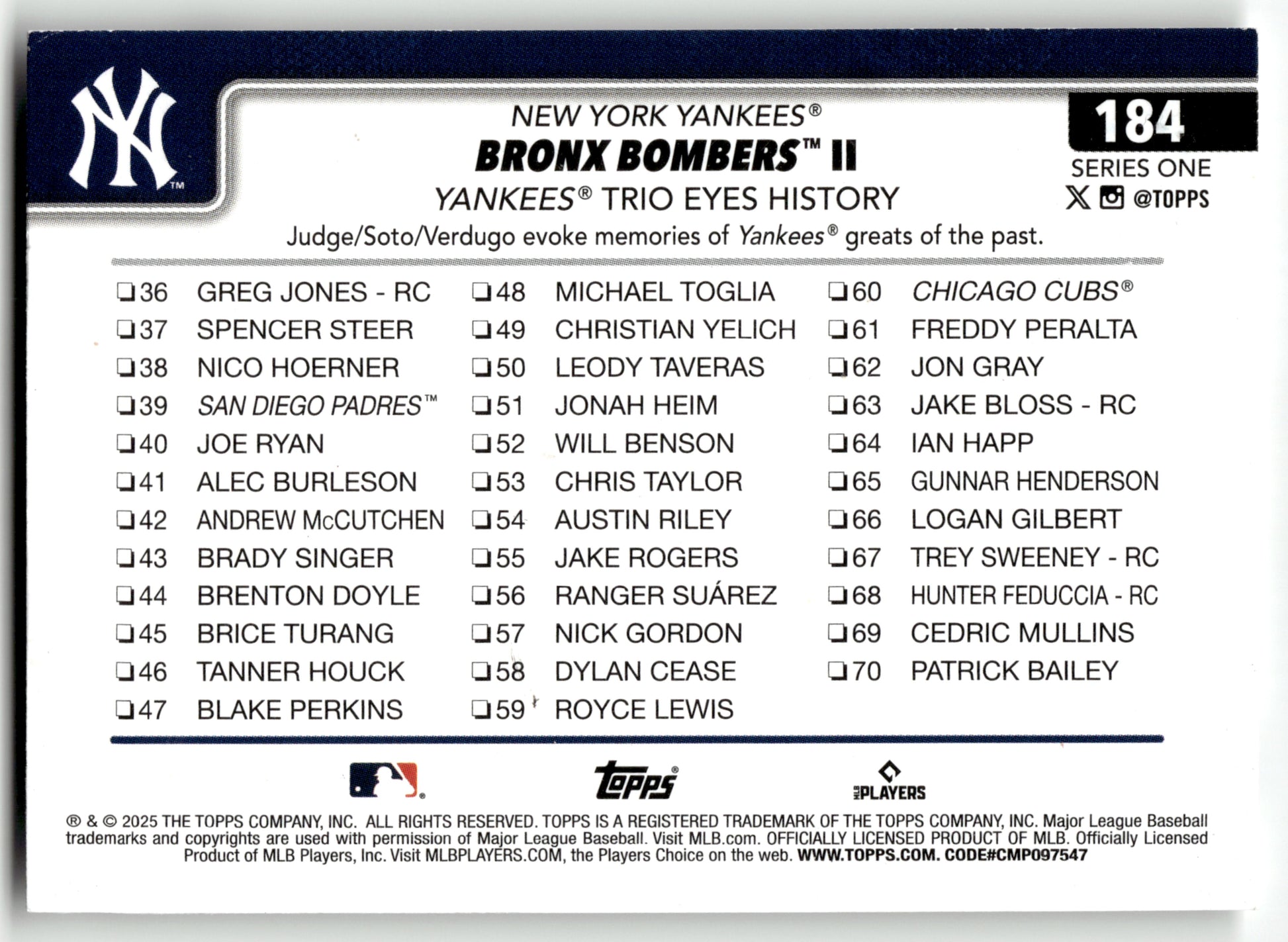 Card: Bronx Bombers II: Yankees Trio Eyes History Team: New York Yankees Card No: #184 Set: 2025 Topps Year: 2025 Brand: Topps Location: Assorted 001 001 001 G