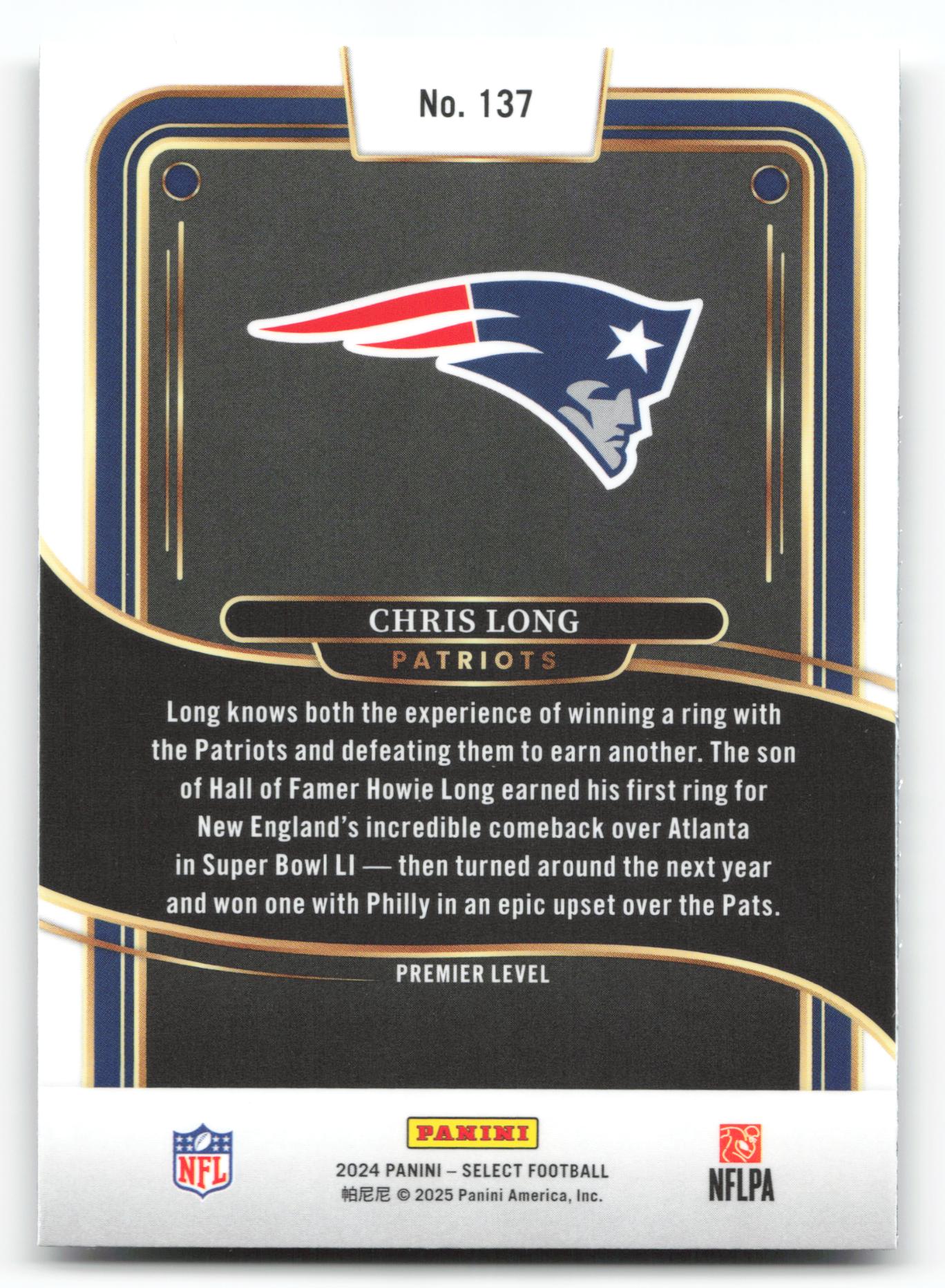 Card: Chris Long Team: New England Patriots Card No: #137 Set: 2024 Panini Select Year: 2024 Brand: Panini Location: Baseball 001 B 5 Z
