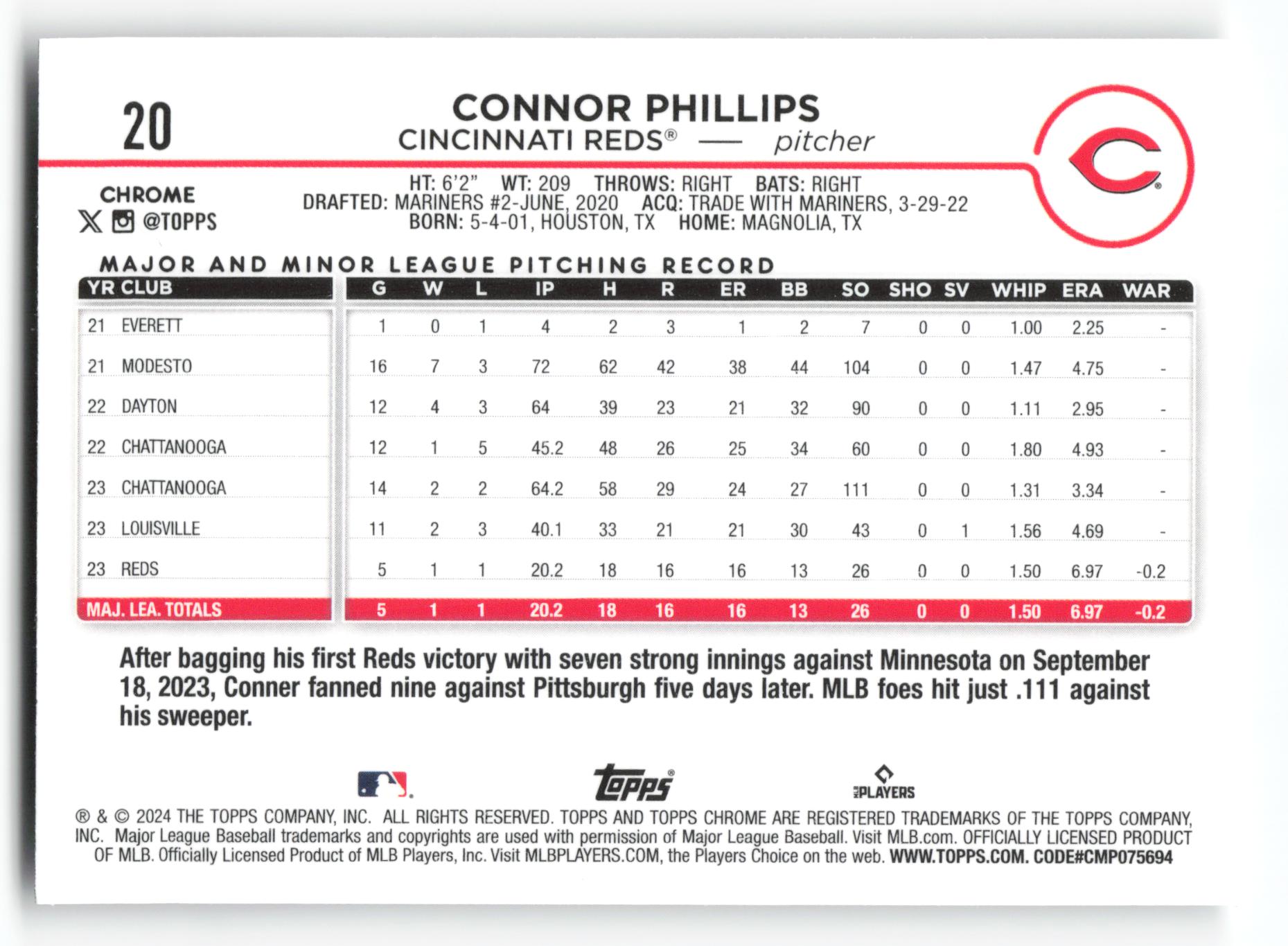 Card: Connor Phillips Team: Cincinnati Reds Card No: #20 Set: 2024 Topps Chrome Year: 2024 Brand: Topps Location: Baseball 001 B 5 Z