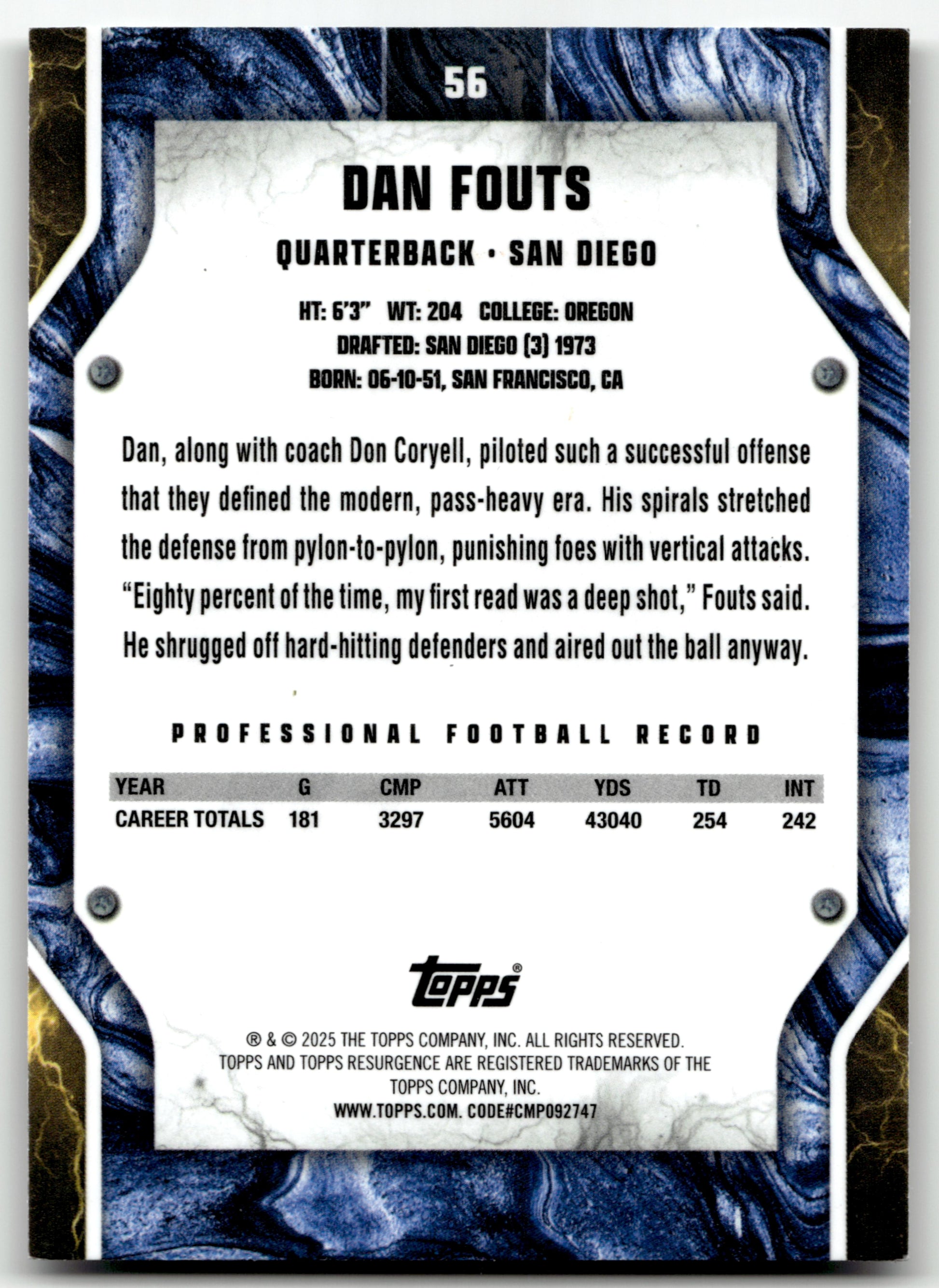 Card: Dan Fouts Team: San Diego Chargers Card No: #56 Set: 2024 Topps Resurgence Year: 2024 Brand: Topps Location: Assorted 001 001 001 D