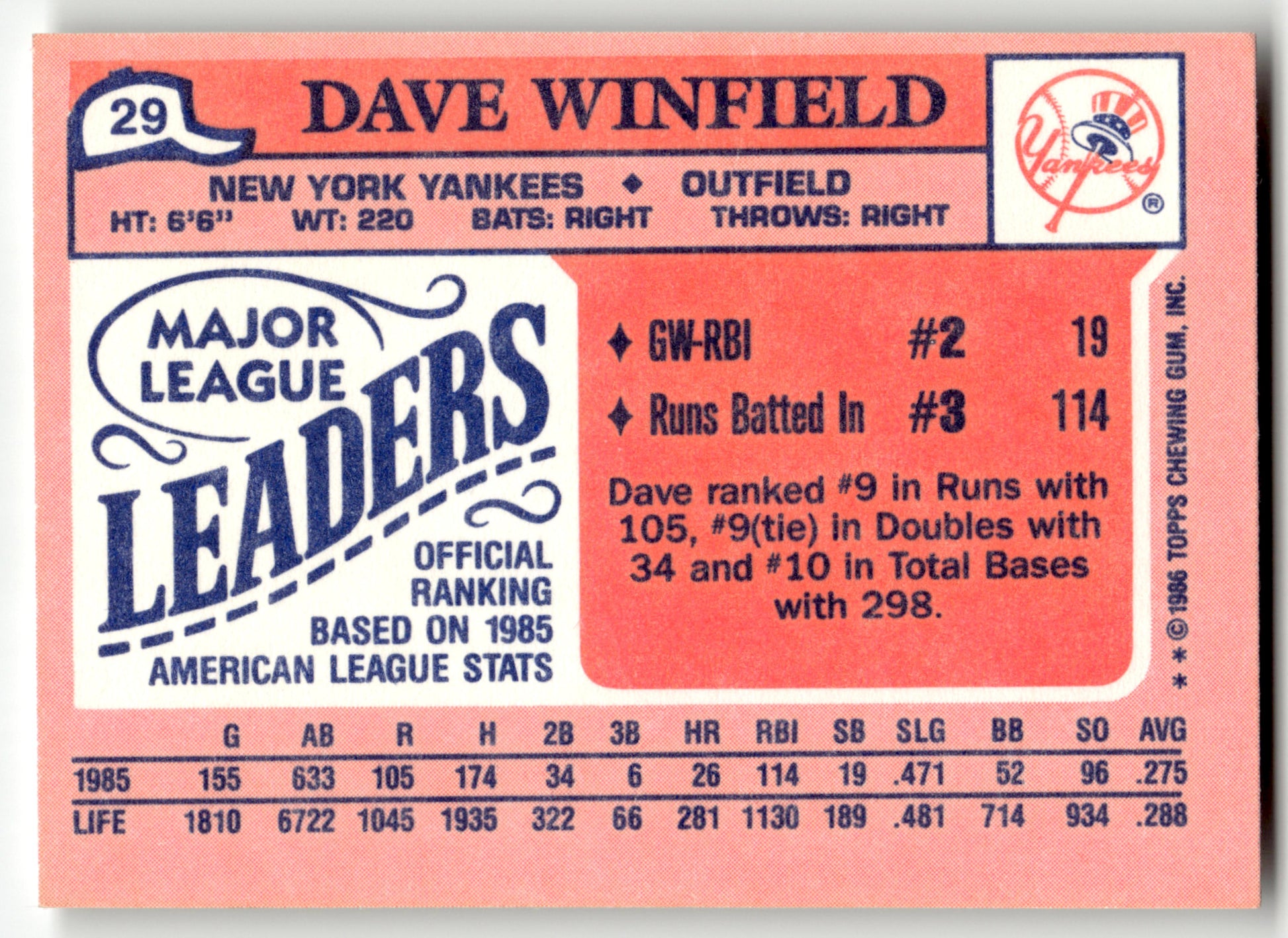 Card: Dave Winfield Team: New York Yankees Card No: #29 Set: 1986 Topps Major League Leaders Minis Year: 1986 Brand: Topps Location: Baseball 001 B 5 Y