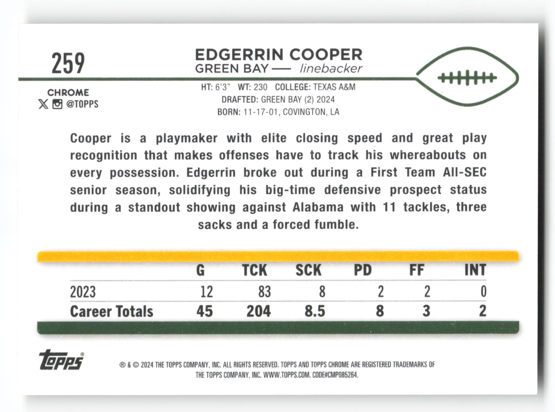 Card: Edgerrin Cooper Team: Green Bay Packers Card No: #259 Set: 2024 Topps Chrome Year: 2024 Brand: Topps Location: Baseball 001 B 5 Z