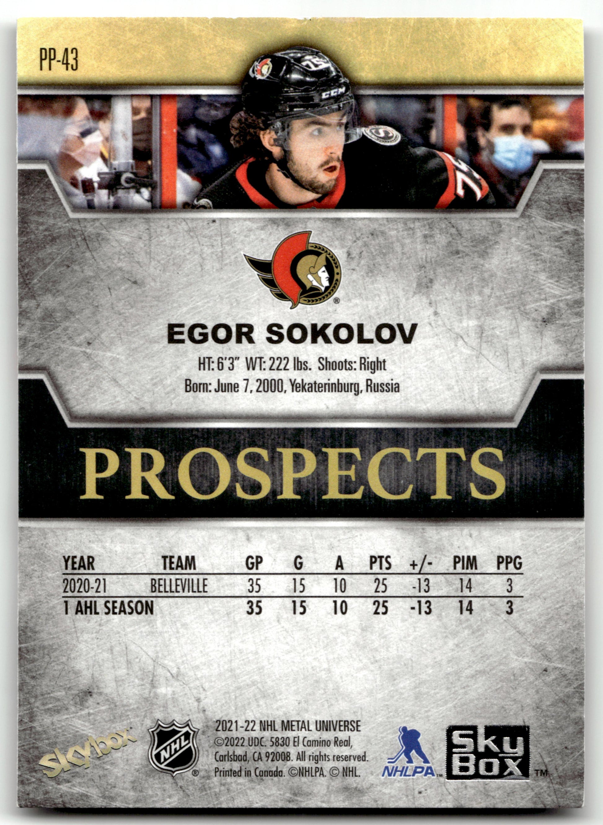Egor Sokolov - #PP-43 - 2021-22 SkyBox Metal Universe -