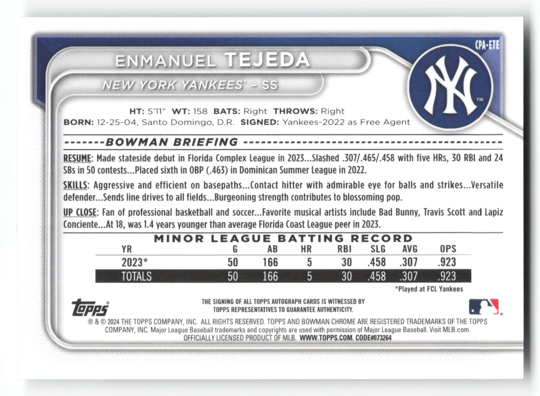 Card: Enmanuel Tejeda Team: New York Yankees Card No: #CPA-ETE Set: 2024 Bowman Year: 2024 Brand: Bowman Location: Baseball 001 B 5 Z