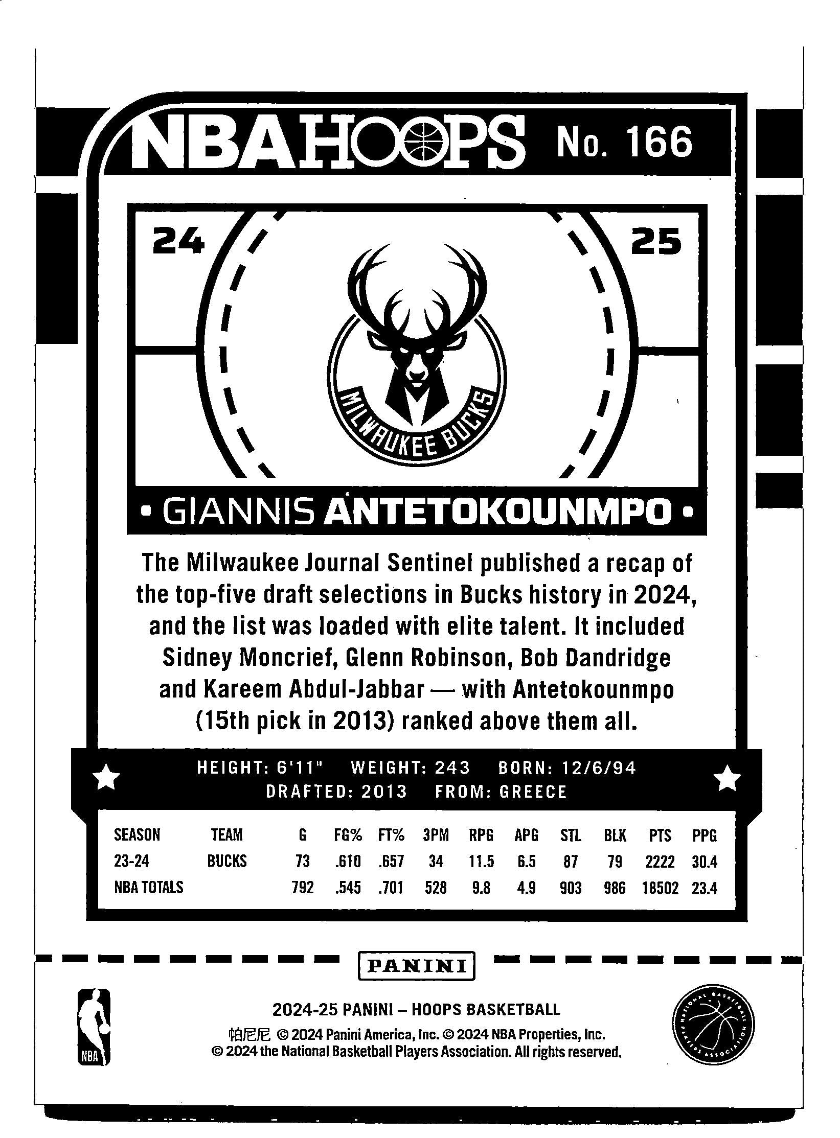Card: Giannis Antetokounmpo Team: Milwaukee Bucks Card No: #166 Set: 2024-25 Hoops Year: 2024 Brand: Location: Baseball 001 B 5 Z