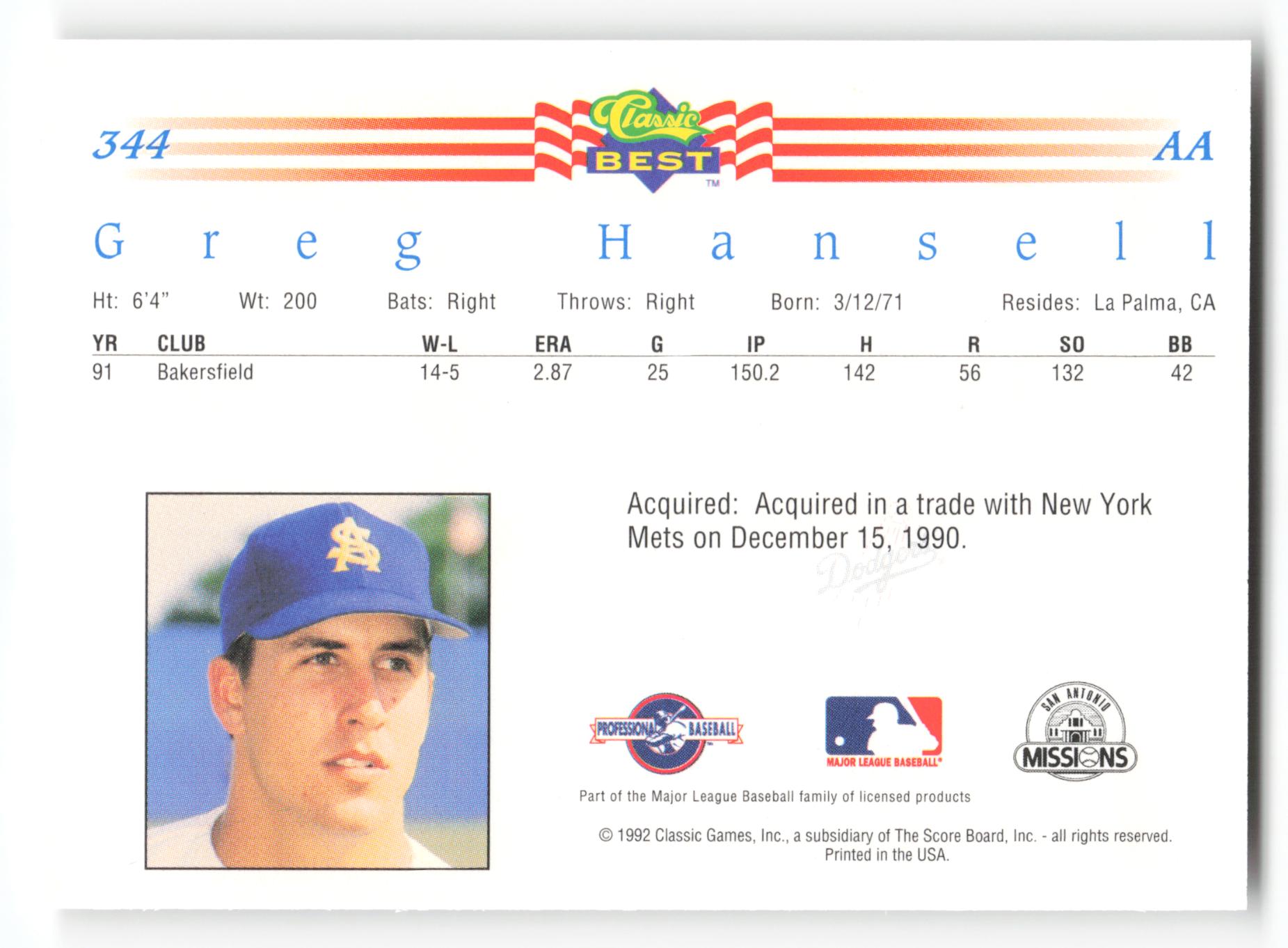 Card: Greg Hansell Team: San Antonio Missions Card No: #344 Set: 1992 Classic Best Year: 1992 Brand: MLB Location: Baseball 001 001 5 Sec A
