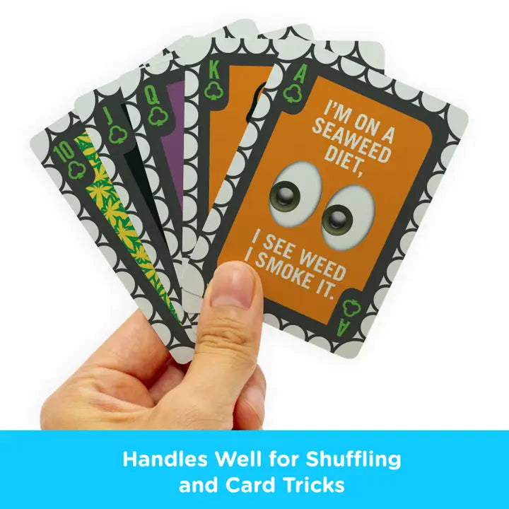 This fun and functional 54-card deck is perfect for weed lovers! Each card features a unique weed-themed design, packed with fun facts and memes. Great for parties, game nights, or as a quirky gift for birthdays, holidays, or stocking stuffers. Play your favorite games with a twist—no two cards are the same!