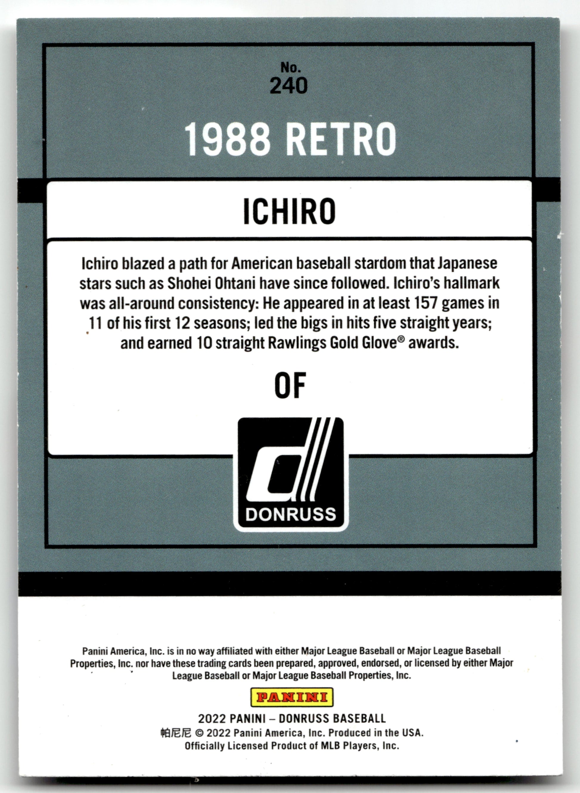 Card: Ichiro Team: Seattle Mariners Card No: #240b Set: 2022 Donruss Year: 2022 Brand: Donruss Location: Assorted 001 001 001 G