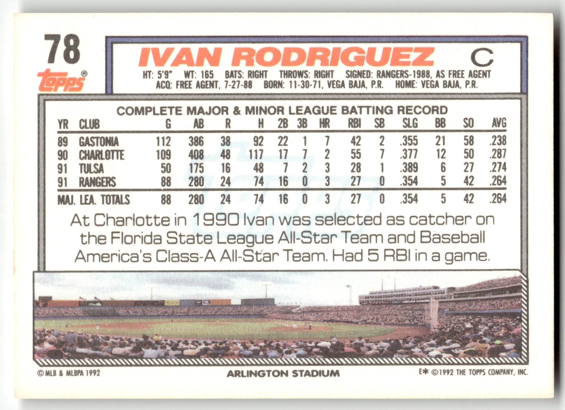 Card: Ivan Rodriguez Team: Texas Rangers Card No: #78 Set: 1992 Topps Year: 1992 Brand: Topps Location: Baseball 001 B 5 Y