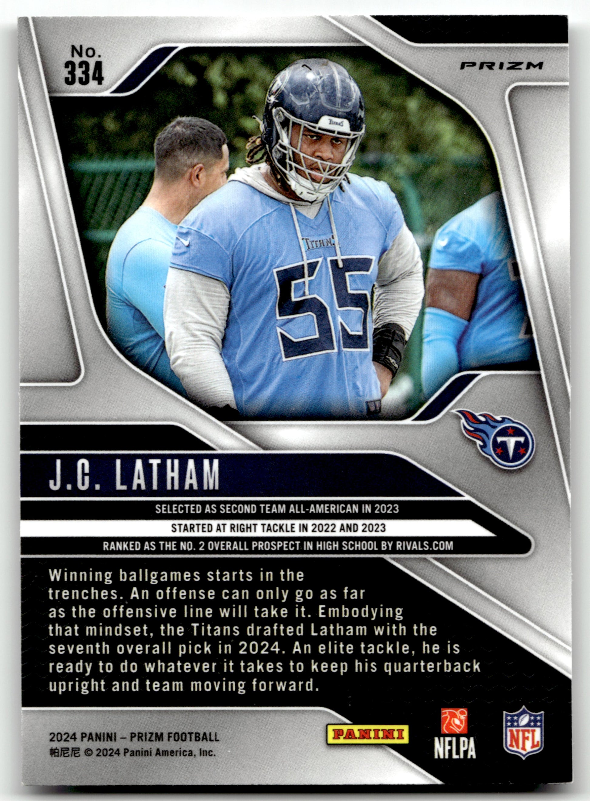 Card: J.C. Latham Team: Tennessee Titans Card No: #334 Set: 2024 Panini Prizm Year: 2024 Brand: Panini Location: Assorted 001 001 001 E