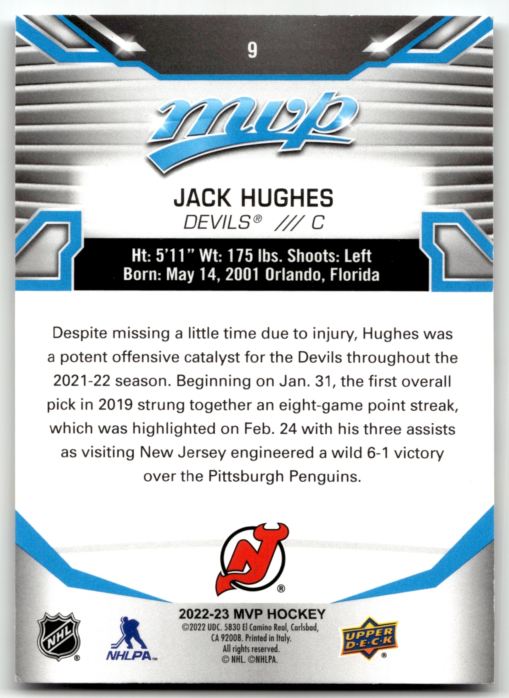 Card: Jack Hughes Team: New Jersey Devils Card No: #9 Set: 2022-23 Upper Deck MVP Year: 2022 Brand: Upper Deck Location: Assorted 001 001 001 C