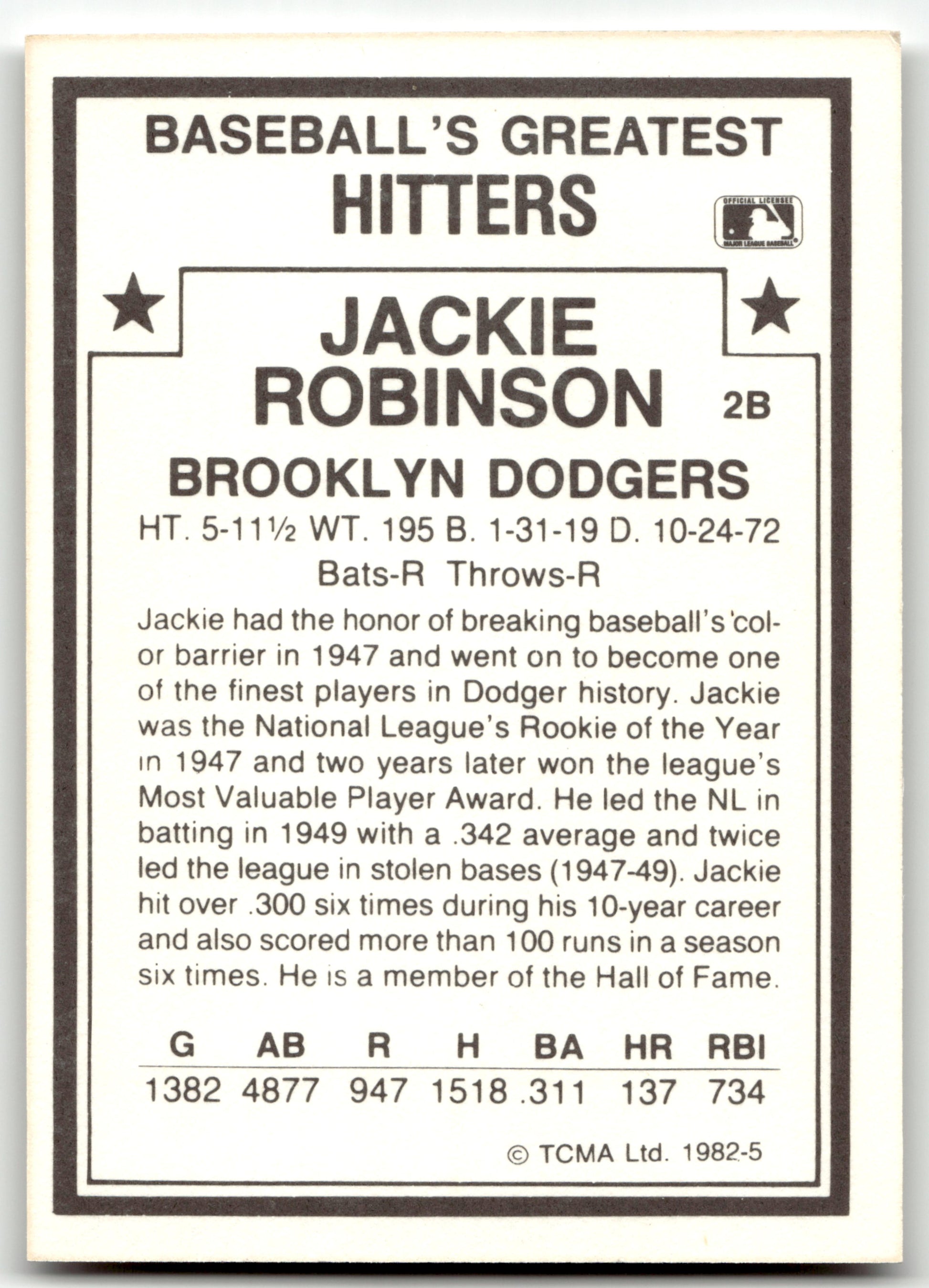 Card: Jackie Robinson Team: Brooklyn Dodgers Card No: #5 Set: 1982 TCMA Baseball's Greatest Hitters (White Backs) Year: 1982 Brand: TCMA Location: Assorted 001 1 1 A