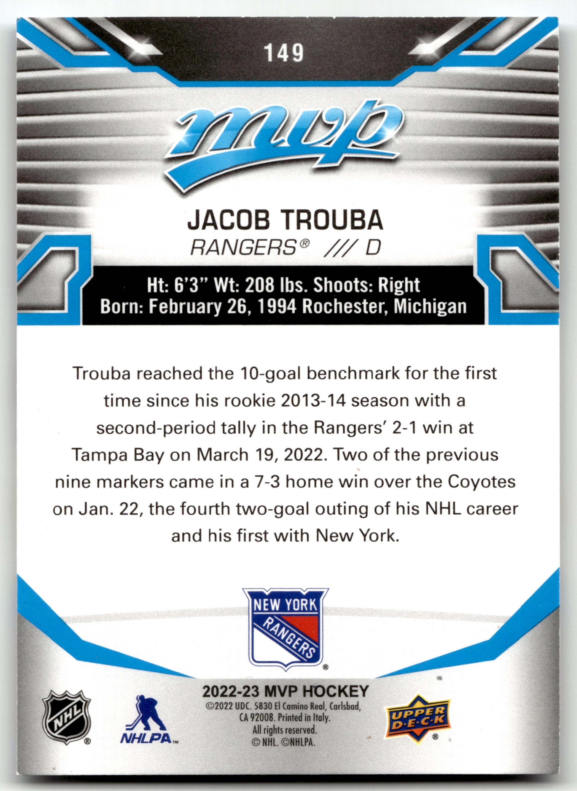 Card: Jacob Trouba Team: New York Rangers Card No: #149 Set: 2022-23 Upper Deck MVP Year: 2022 Brand: Upper Deck Location: Assorted 001 001 001 C