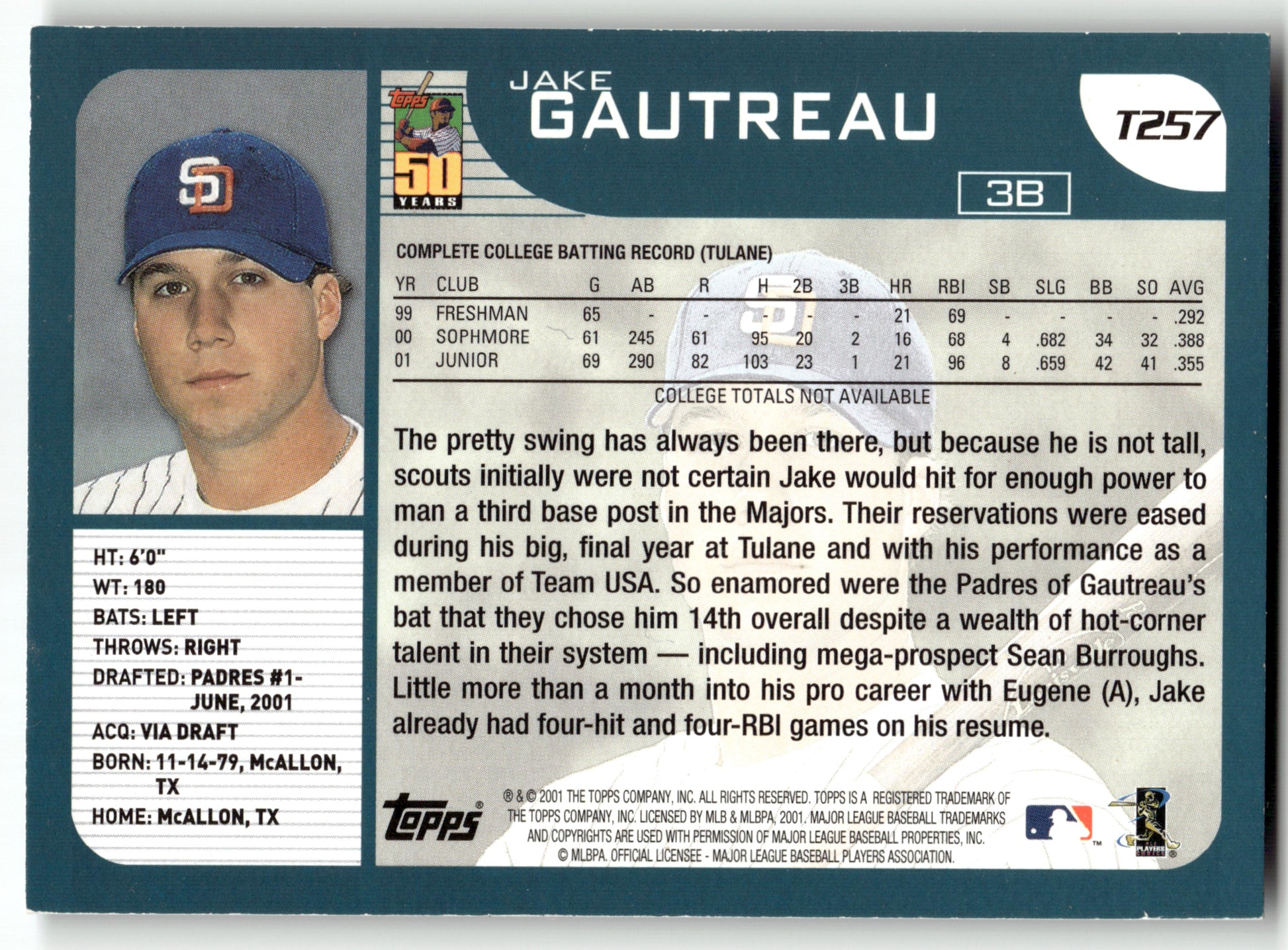 Card: Jake Gautreau Team: San Diego Padres Card No: #T257 Set: 2001 Topps Traded & Rookies Year: 2001 Brand: Topps Location: Assorted 001 001 001 F