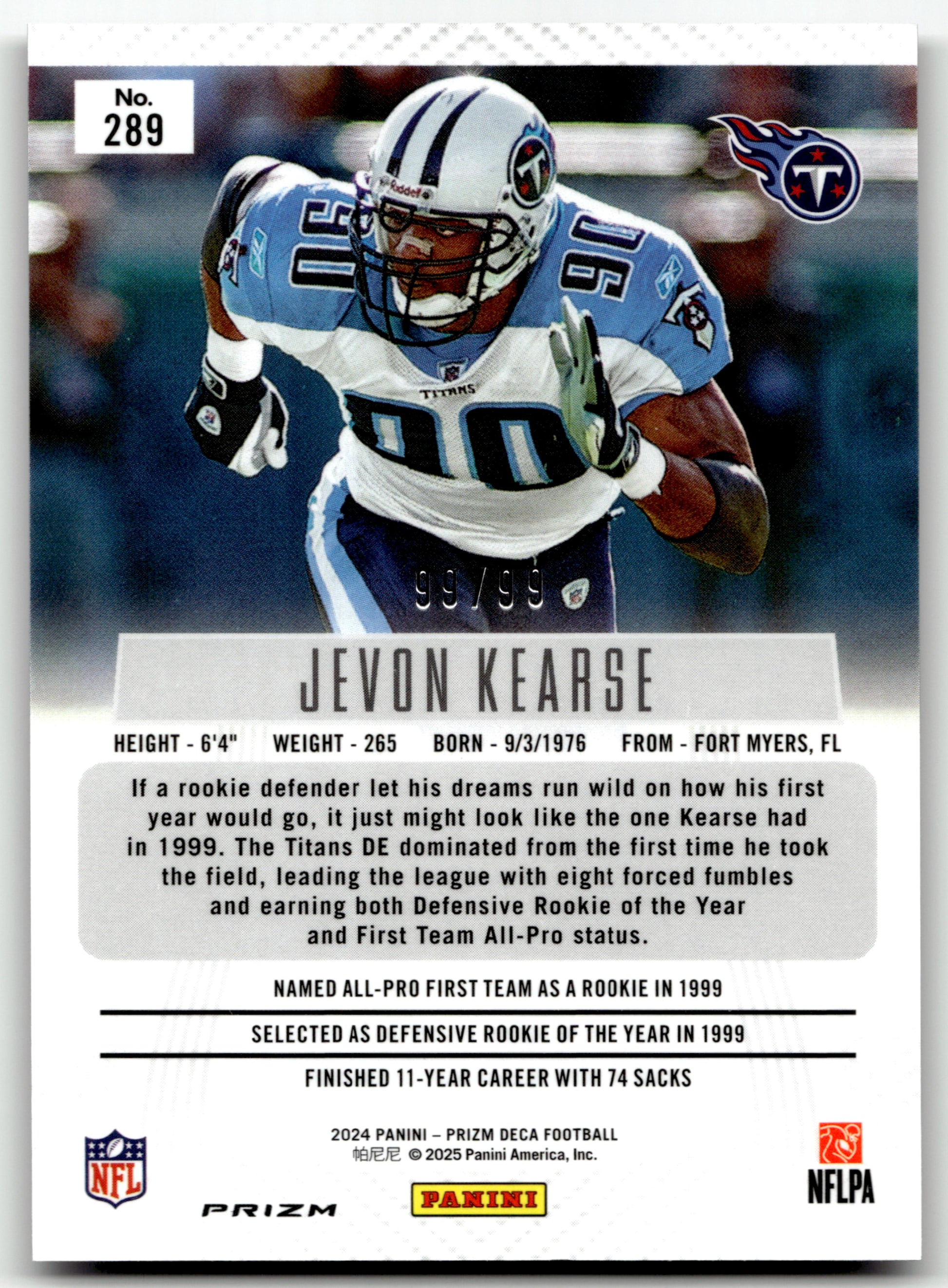 Card: Jevon Kearse Team: Tennessee Titans Card No: #289 Set: 2024 Panini Prizm Deca Year: 2024 Brand: Prizm Location: Assorted 001 001 001 D