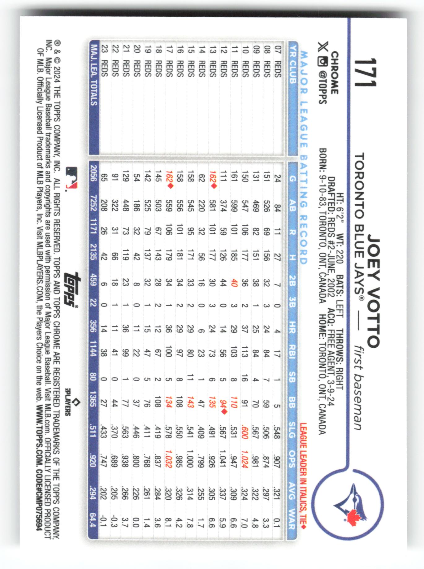Card: Joey Votto Team: Toronto Blue Jays Card No: #171 Set: 2024 Topps Chrome Year: 2024 Brand: Topps Location: Baseball 001 B 5 Z