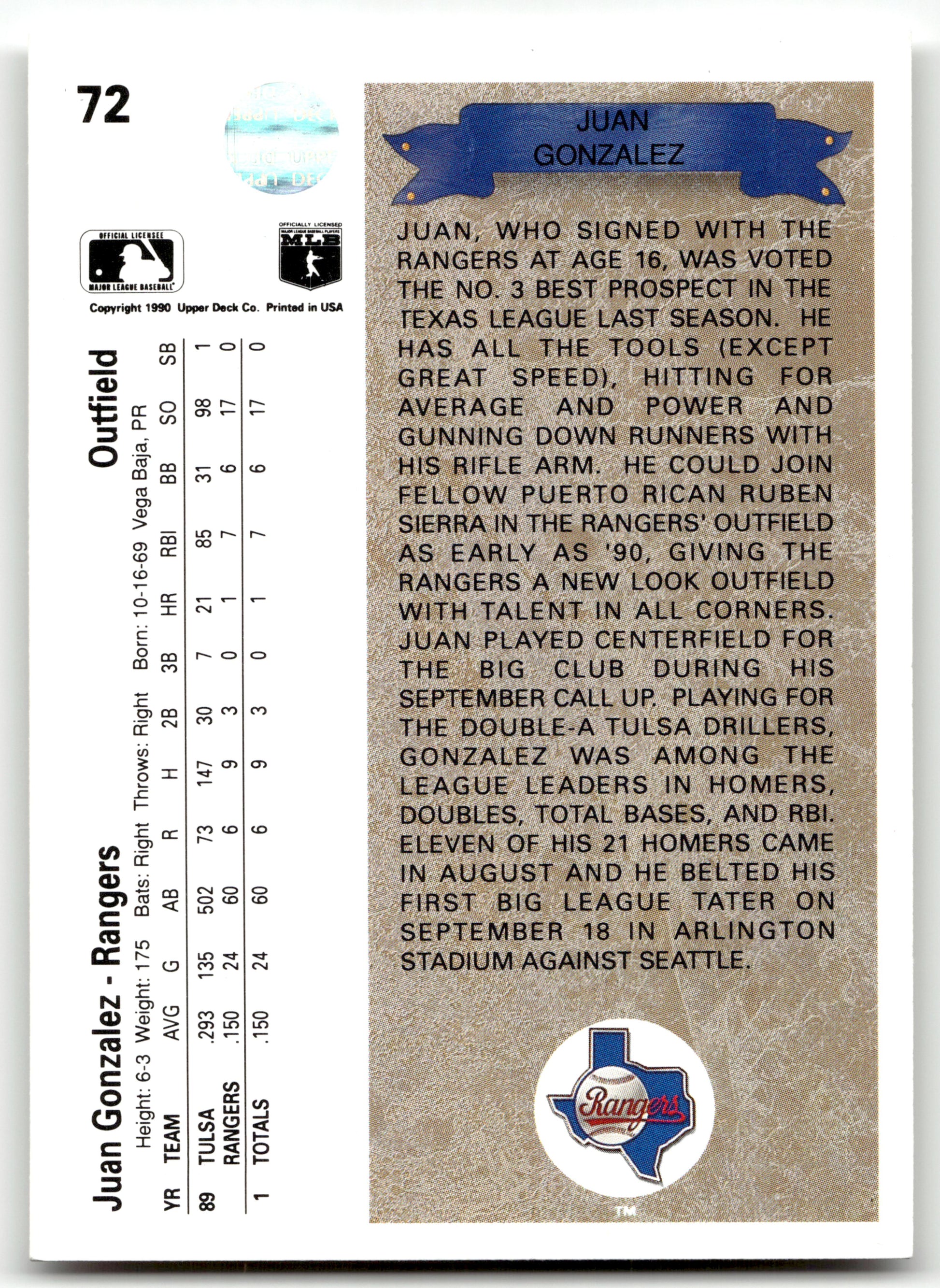 Card: Juan Gonzalez Team: Texas Rangers Card No: #72 Set: 1990 Upper Deck Year: 1990 Brand: Upper Deck Location: Baseball 001 B 5 Y