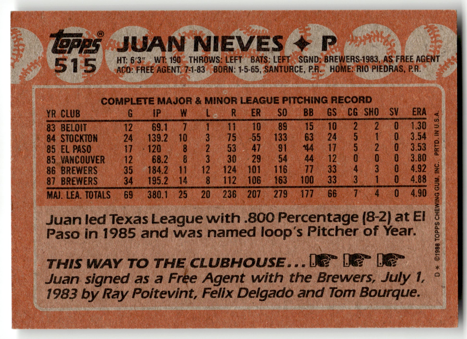 Card: Juan Nieves Team: Milwaukee Brewers Card No: #515 Set: 1988 Topps Year: 1988 Brand: Topps Location: Assorted 001 001 001 C