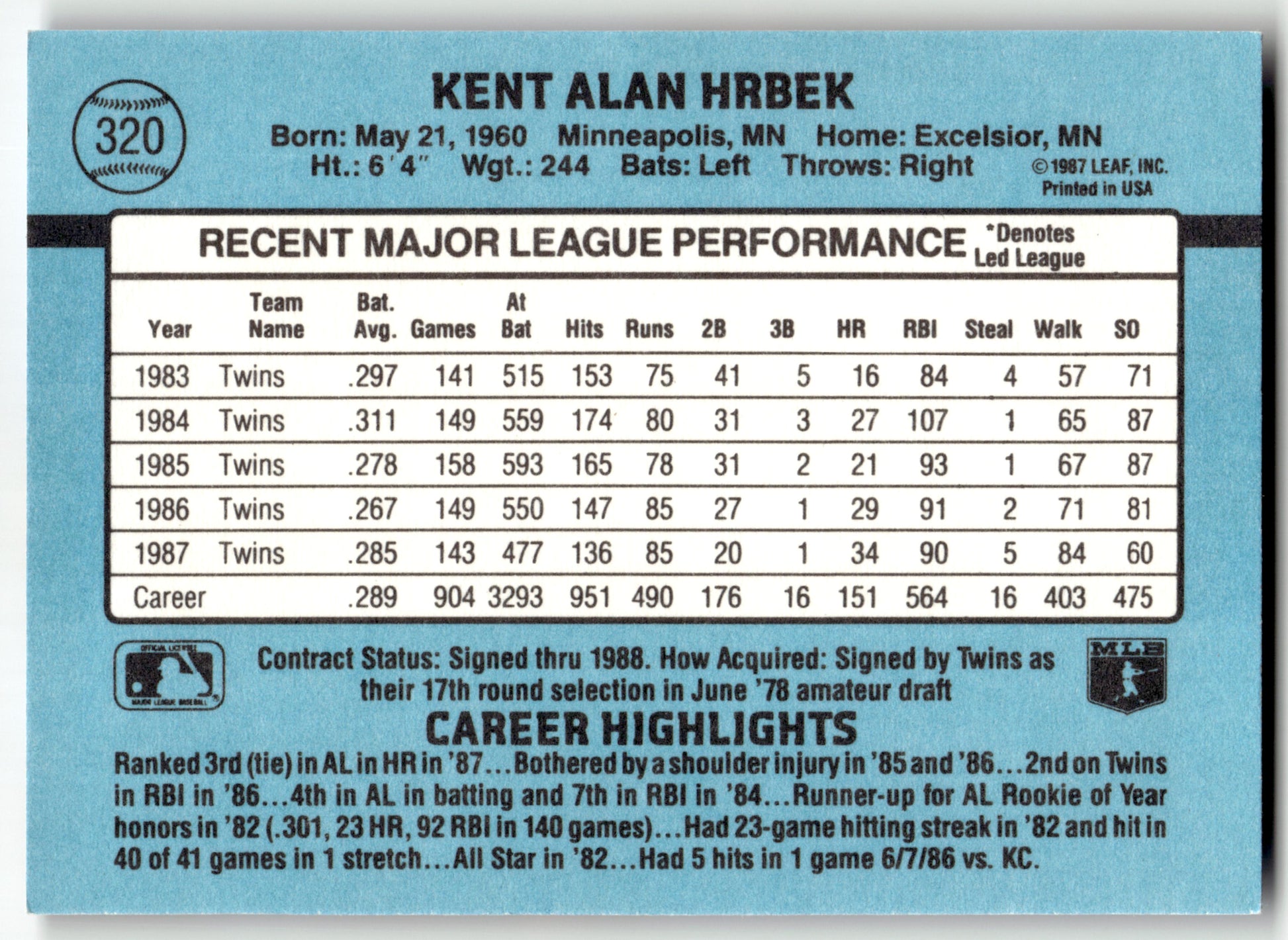 Card: Kent Hrbek Team: Minnesota Twins Card No: #320 Set: 1988 Donruss Year: 1988 Brand: Donruss Location: Assorted 001 001 001 G