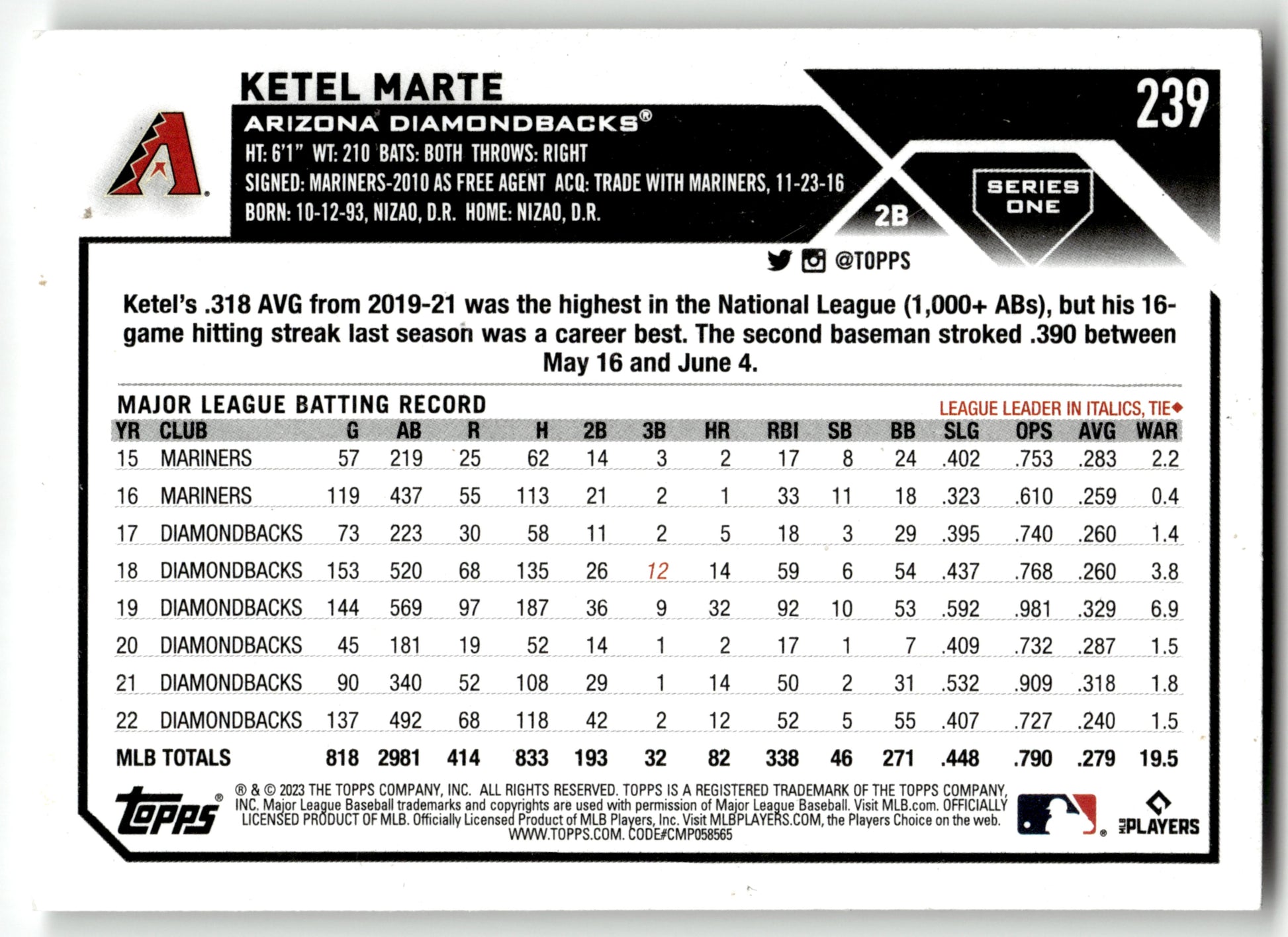 Card: Ketel Marte Team: Arizona Diamondbacks Card No: #239 Set: 2023 Topps Year: 2023 Brand: Topps Location: Assorted 001 001 001 D