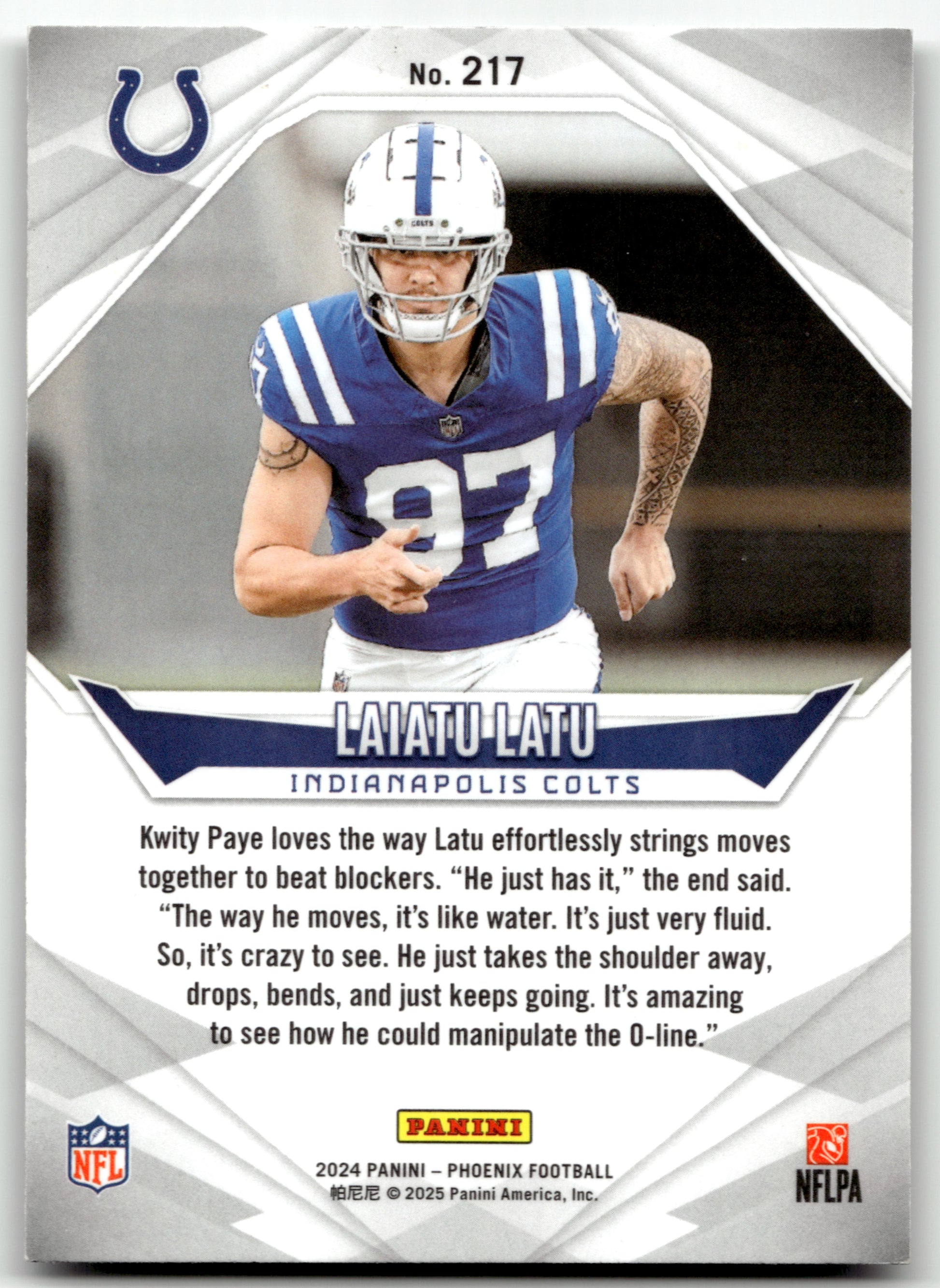 Card: Laiatu Latu Team: Indianapolis Colts Card No: #217 Set: 2024 Panini Phoenix Year: 2024 Brand: Panini Location: Assorted 001 001 001 C