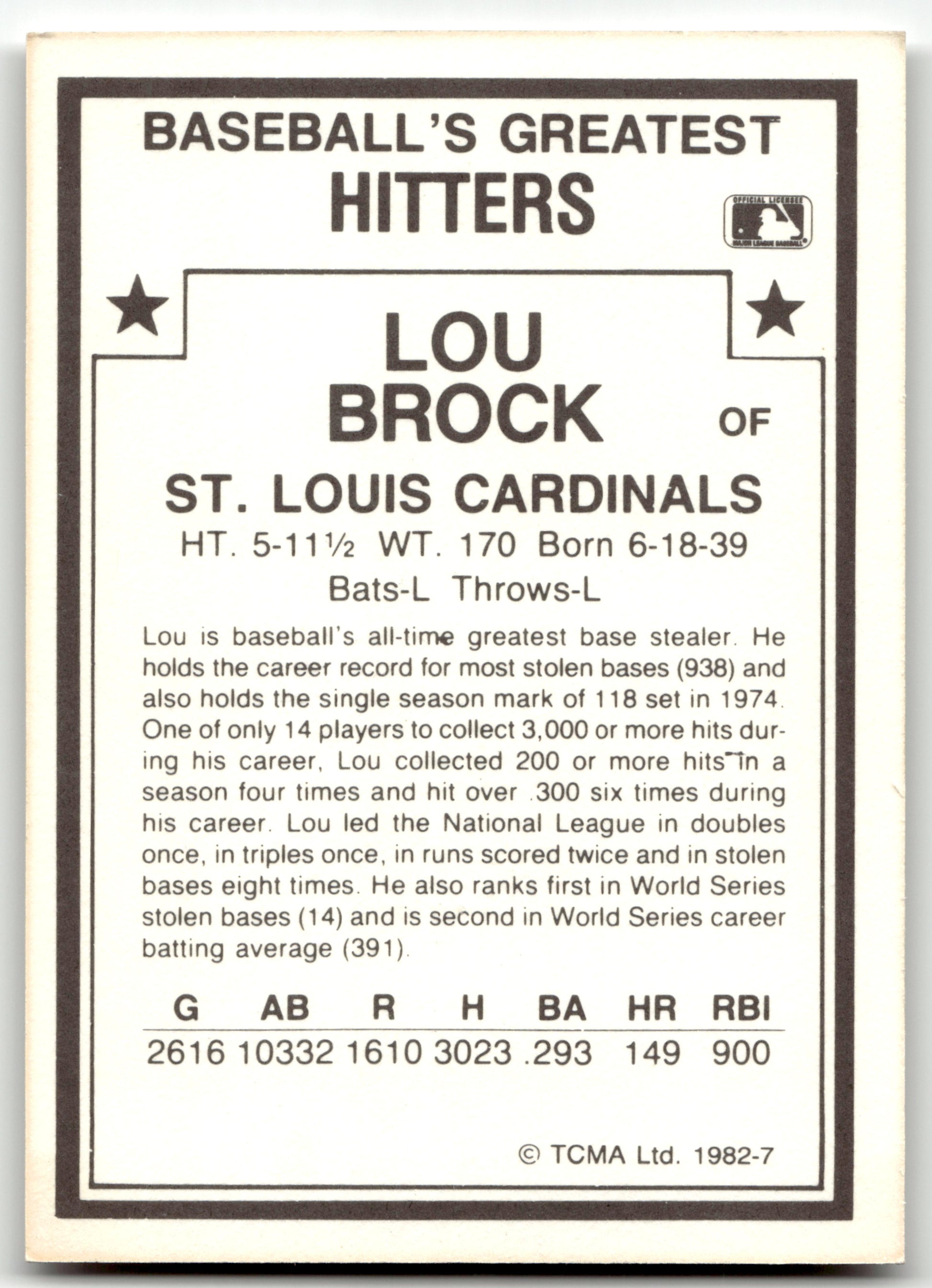 Card: Lou Brock Team: St. Louis Cardinals Card No: #7 Set: 1987 TCMA 1982 Greatest Hitters Year: 1987 Brand: TCMA Location: Assoted 001 001 001 B