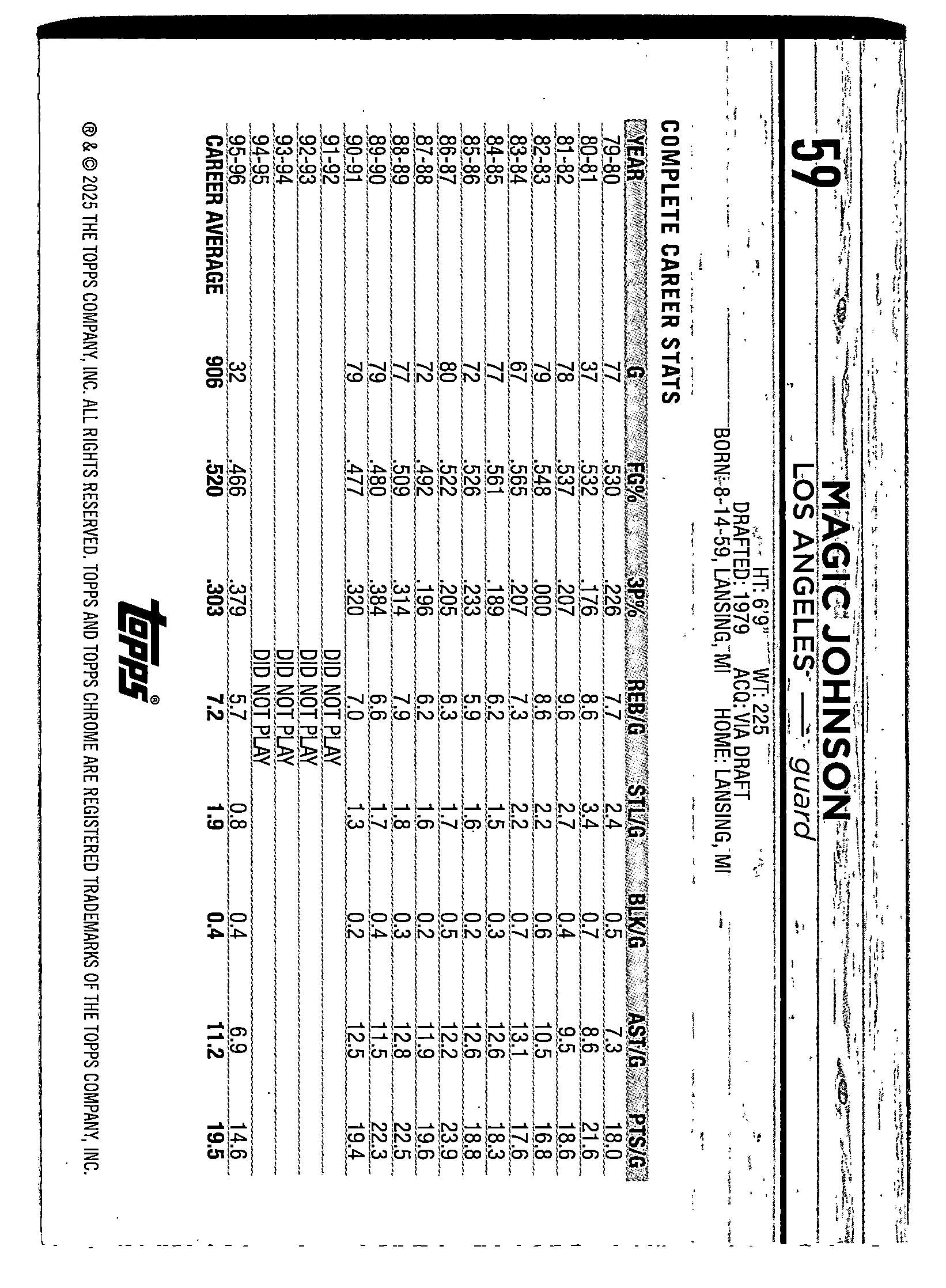Card: Magic Johnson Team: Los Angeles Lakers Card No: #59 Set: 2024-25 Topps Chrome Year: 2024 Brand: Topps Location: Baseball 001 B 5 Z