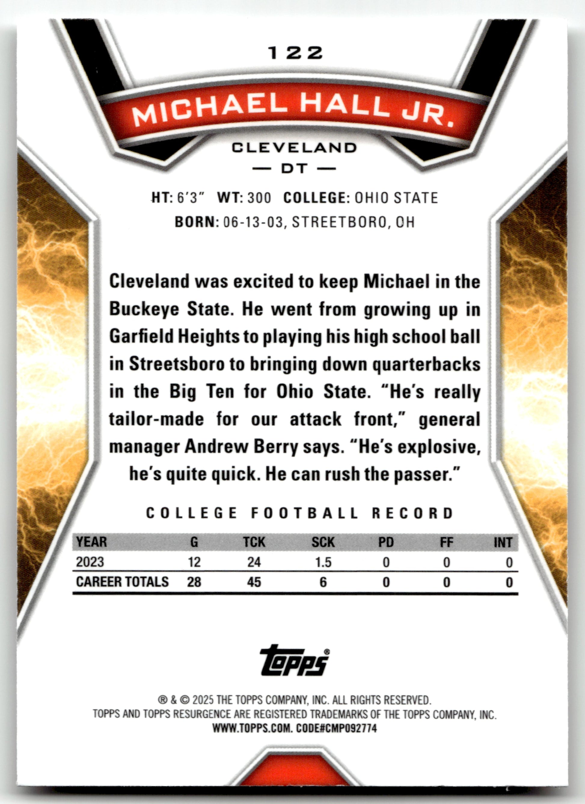 Card: Michael Hall Jr. Team: Cleveland Browns Card No: #122 Set: 2024 Topps Resurgence Year: 2024 Brand: Topps Location: Assorted 001 001 001 C