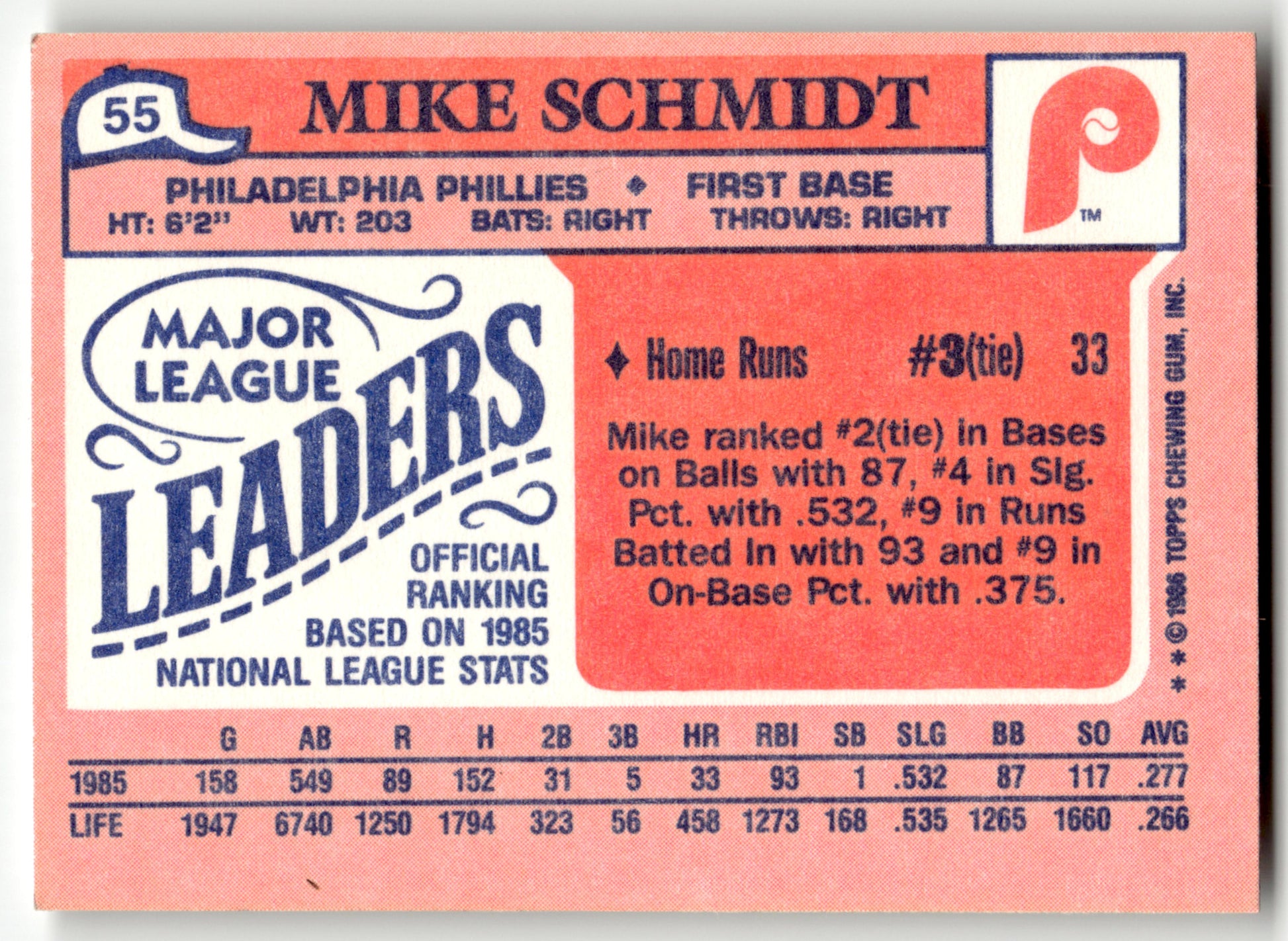 Card: Mike Schmidt Team: Philadelphia Phillies Card No: #55 Set: 1986 Topps Major League Leaders Minis Year: 1986 Brand: Topps Location: Baseball 001 B 5 Y