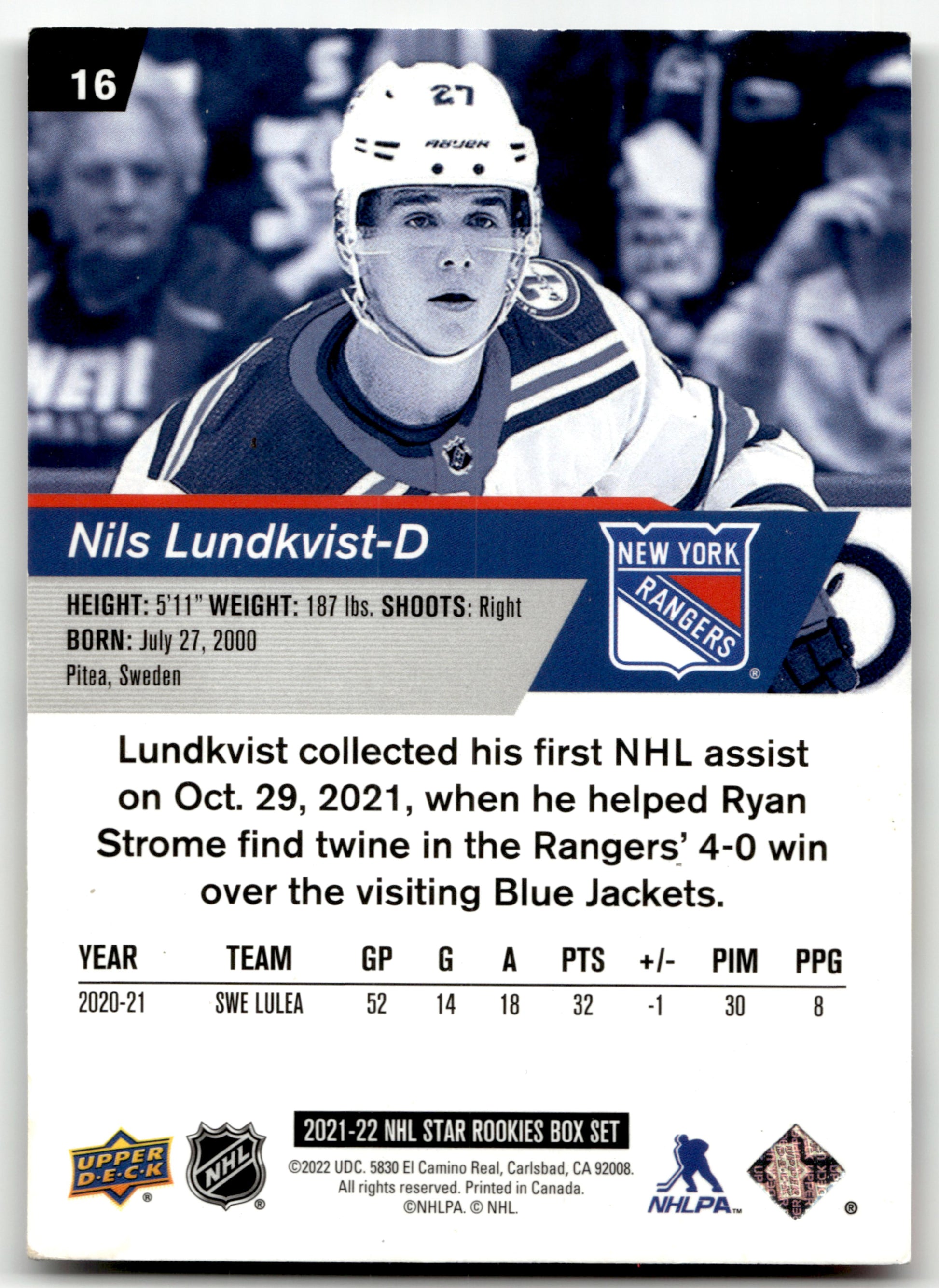 Card: Nils Lundkvist Team: New York Rangers Card No: #16 Set: 2021-22 Upper Deck NHL Star Rookies Box Set Year: 2021 Brand: Location: Assorted 001 001 001 E
