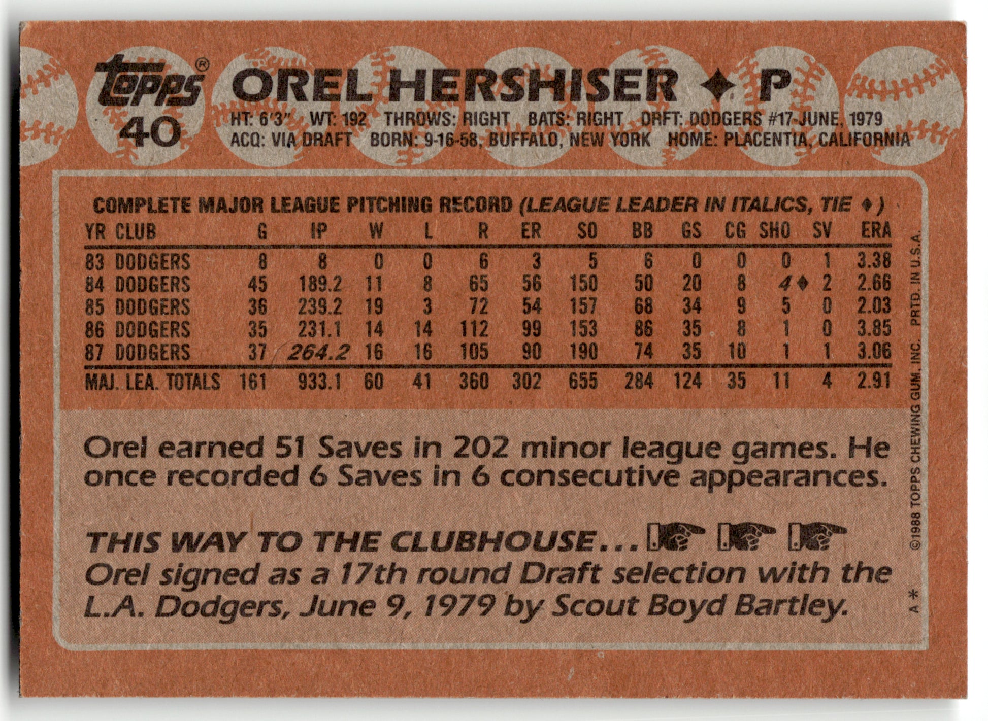Card: Orel Hershiser Team: Los Angeles Dodgers Card No: #40 Set: 1988 Topps Year: 1988 Brand: Topps Location: Assorted 001 001 001 C